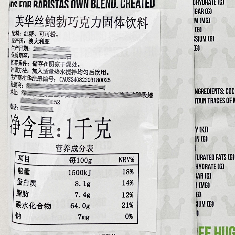 BOB巧克力粉可可粉芙华丝40%澳洲进口冲饮热巧克力饮品咖啡拿铁
