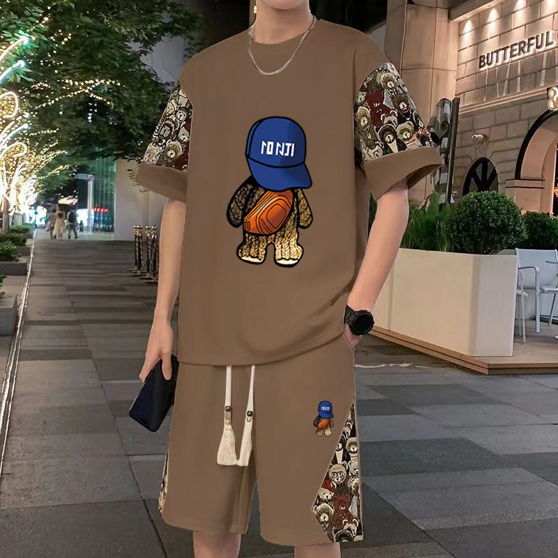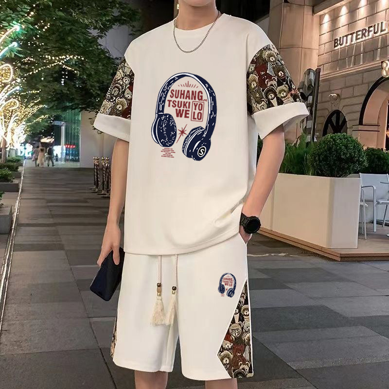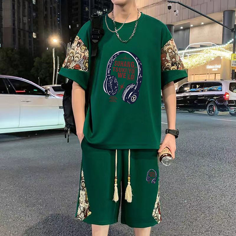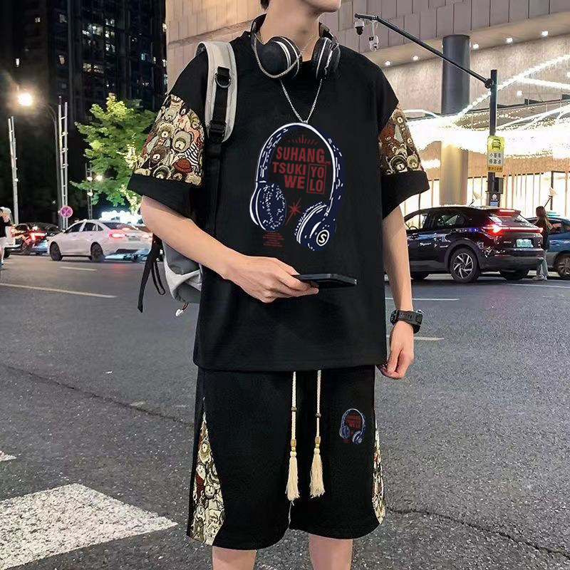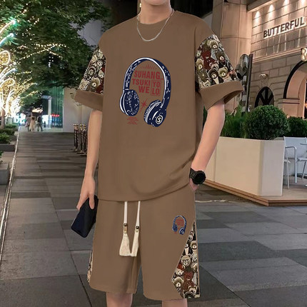 新中式华夫格休闲套装短袖t恤男夏季大码宽松搭配运动短裤两件套