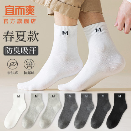 宜而爽袜子男士春秋款中筒袜棉袜防臭吸汗运动纯色短筒袜夏天薄款