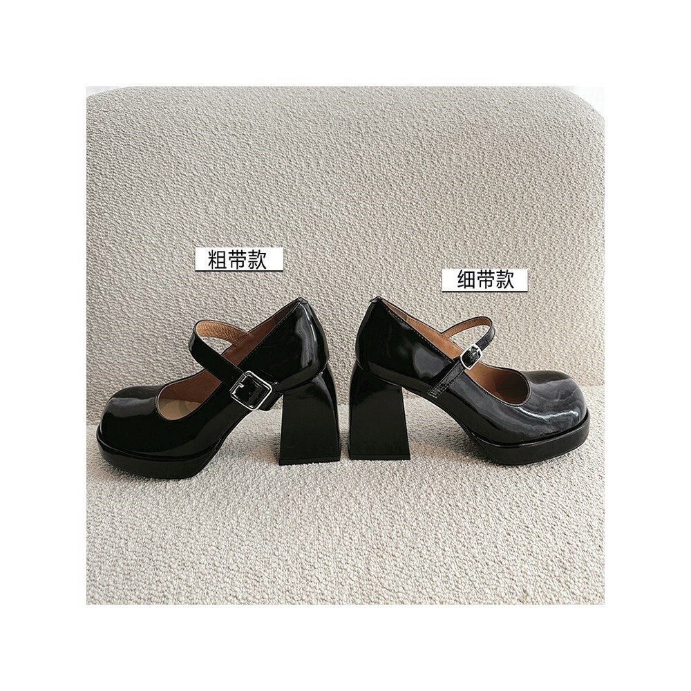 黑色粗跟高跟鞋2026春季新款一字扣带玛丽珍鞋浅口真皮单鞋女圆头