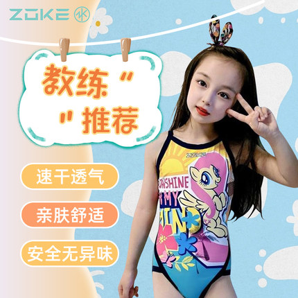 ZOKE洲克儿童泳衣女童可爱卡通青少年三角连体专业训练游泳衣女孩