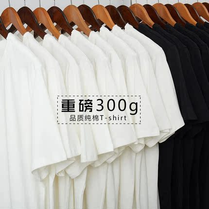 300G重磅新疆纯棉圆领宽松厚实美式复古纯白色小领口短袖t恤男女