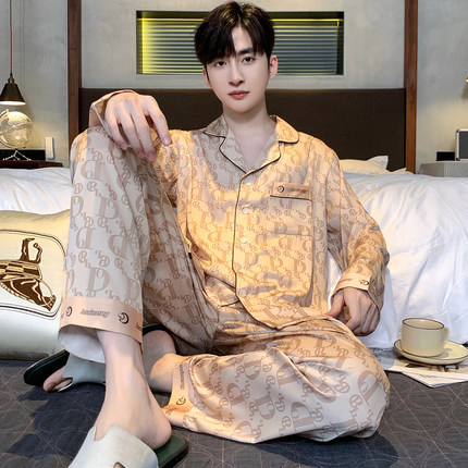 睡衣男士春秋季薄款冰丝奢华长袖青少年男生加大码家居服两件套装