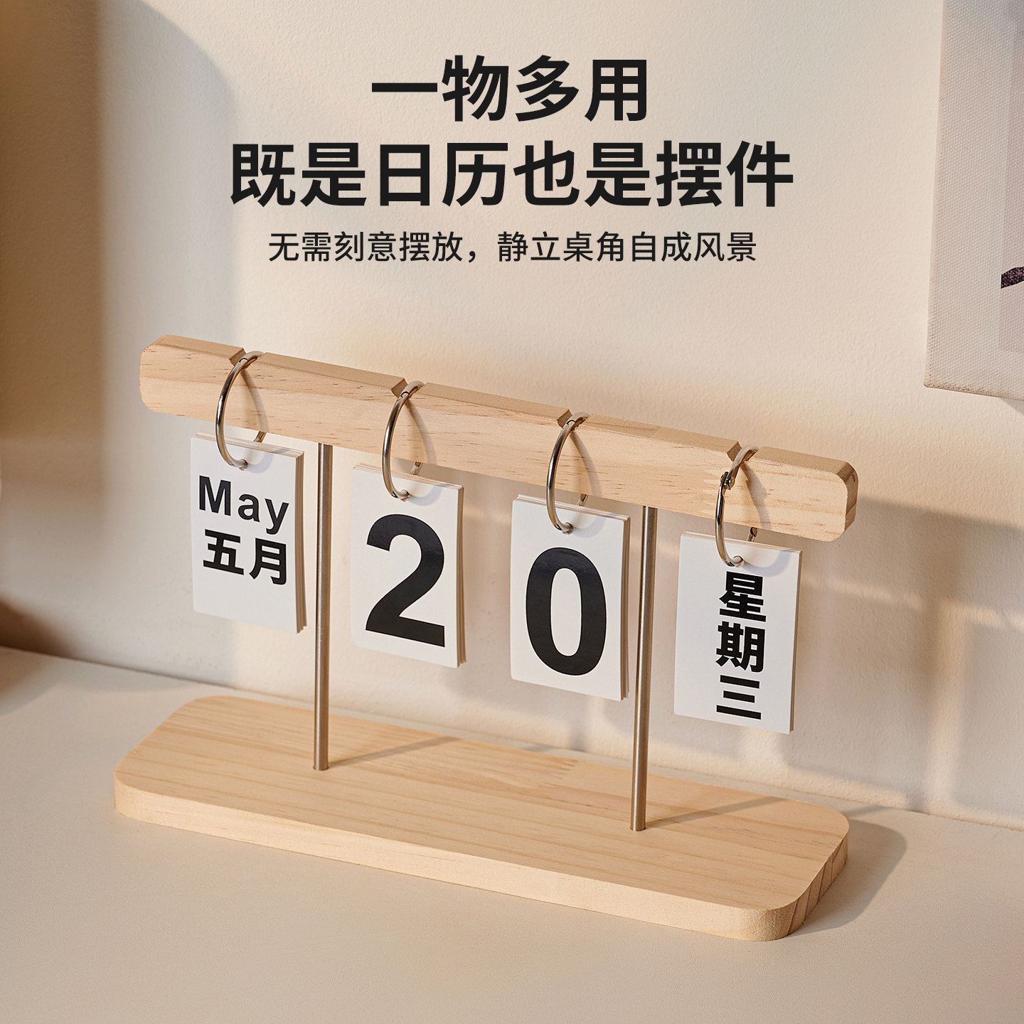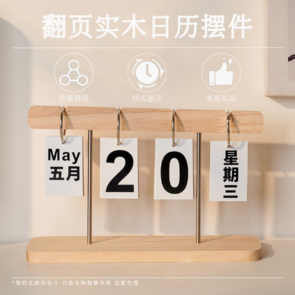 简约木质翻页日历台式挂牌卧室书房办公室桌面装饰拍照道具万年历