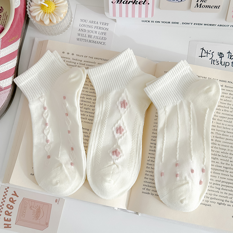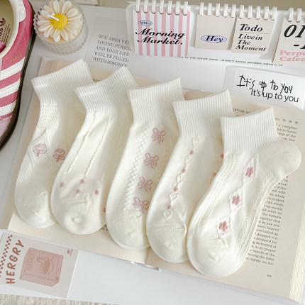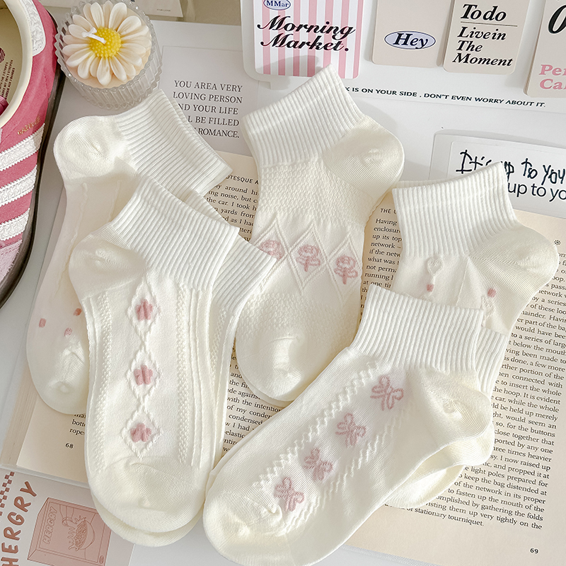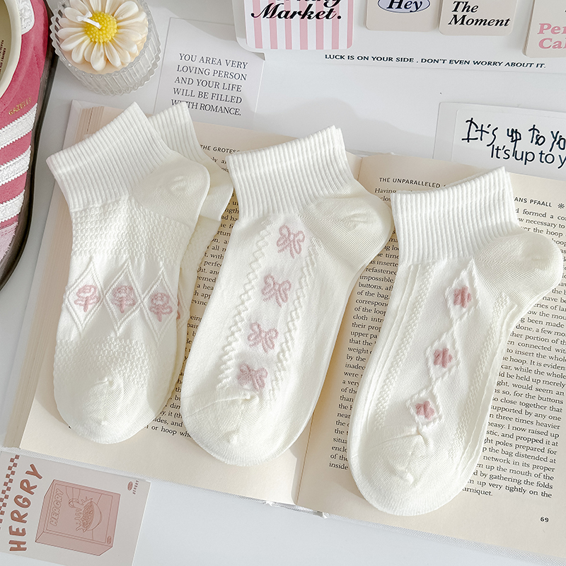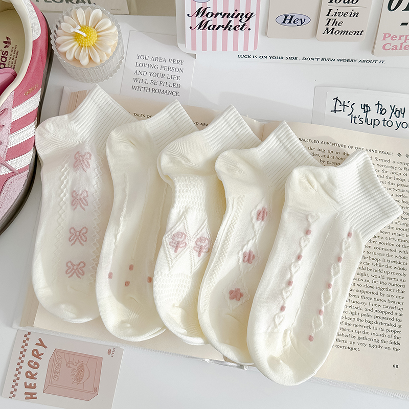 粉色奶白袜子女纯棉短袜春夏反织花薄款运动风透气甜美女船袜日系