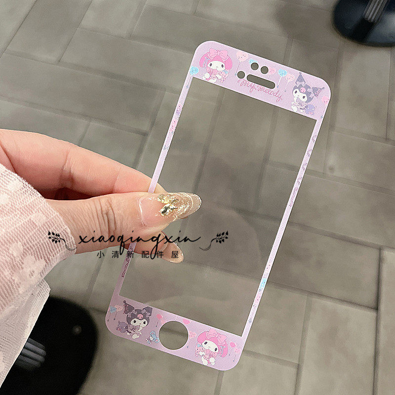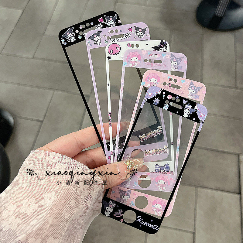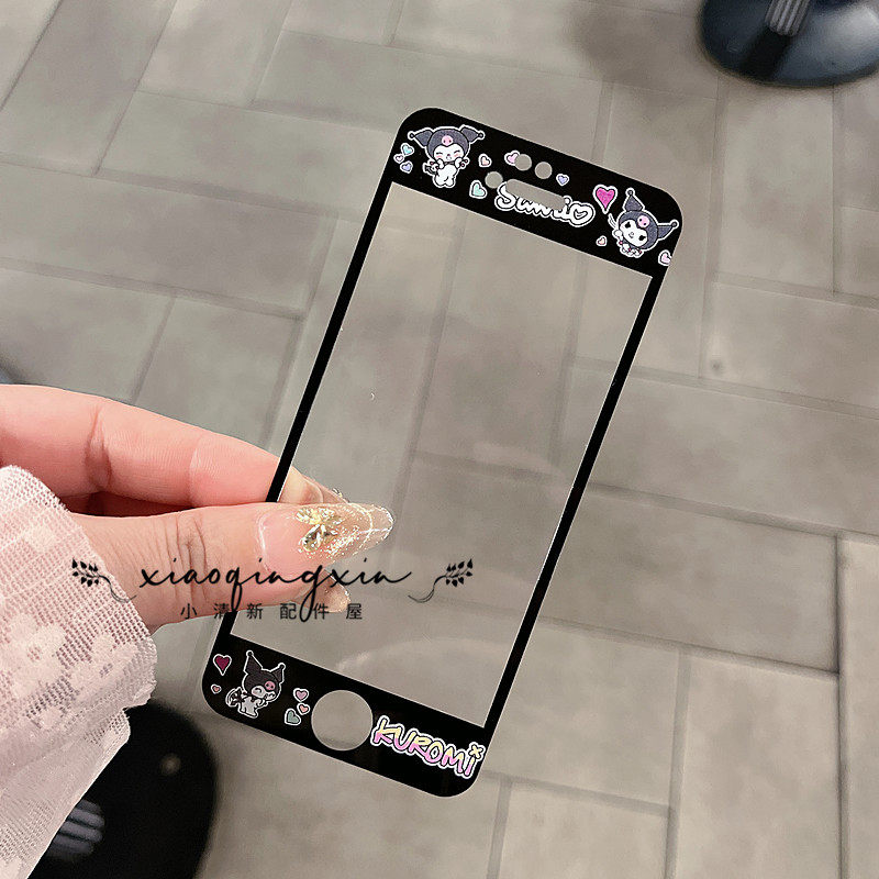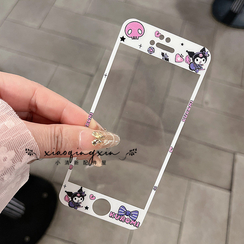 卡通库洛米适用苹果4/4S/5/5S可爱钢化玻璃贴膜新款iPhone6/7/8plus全屏黑白手机彩膜SE2/3美乐蒂