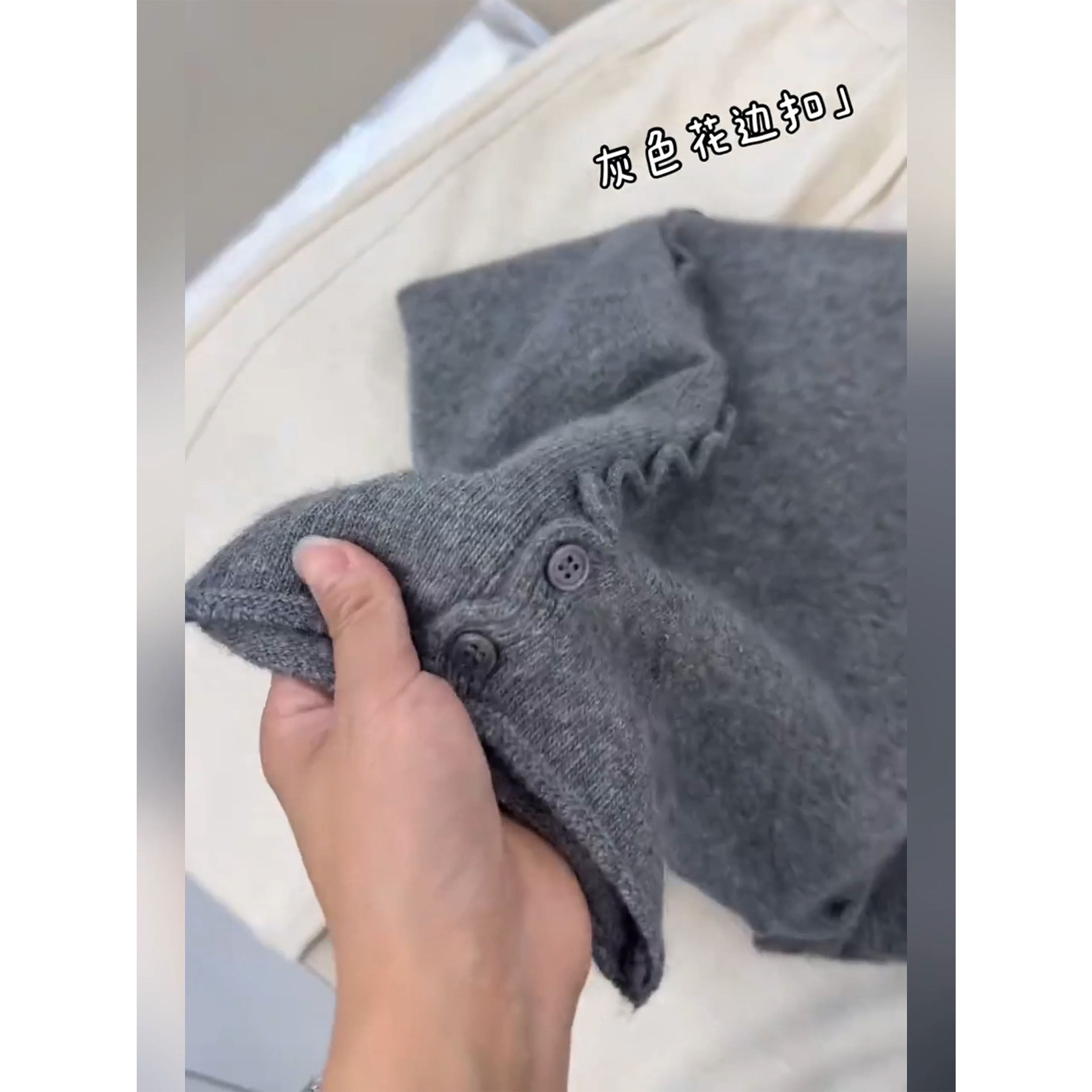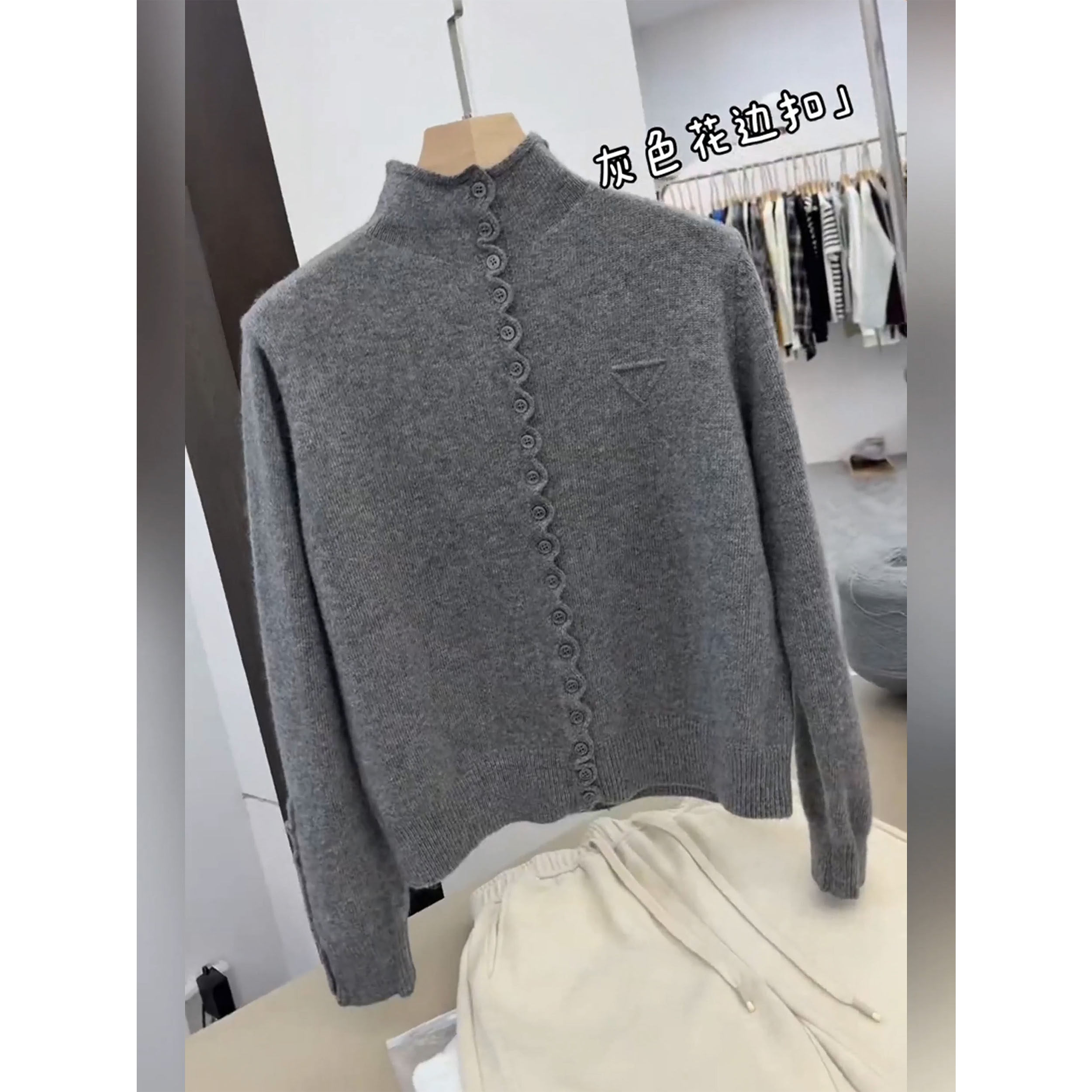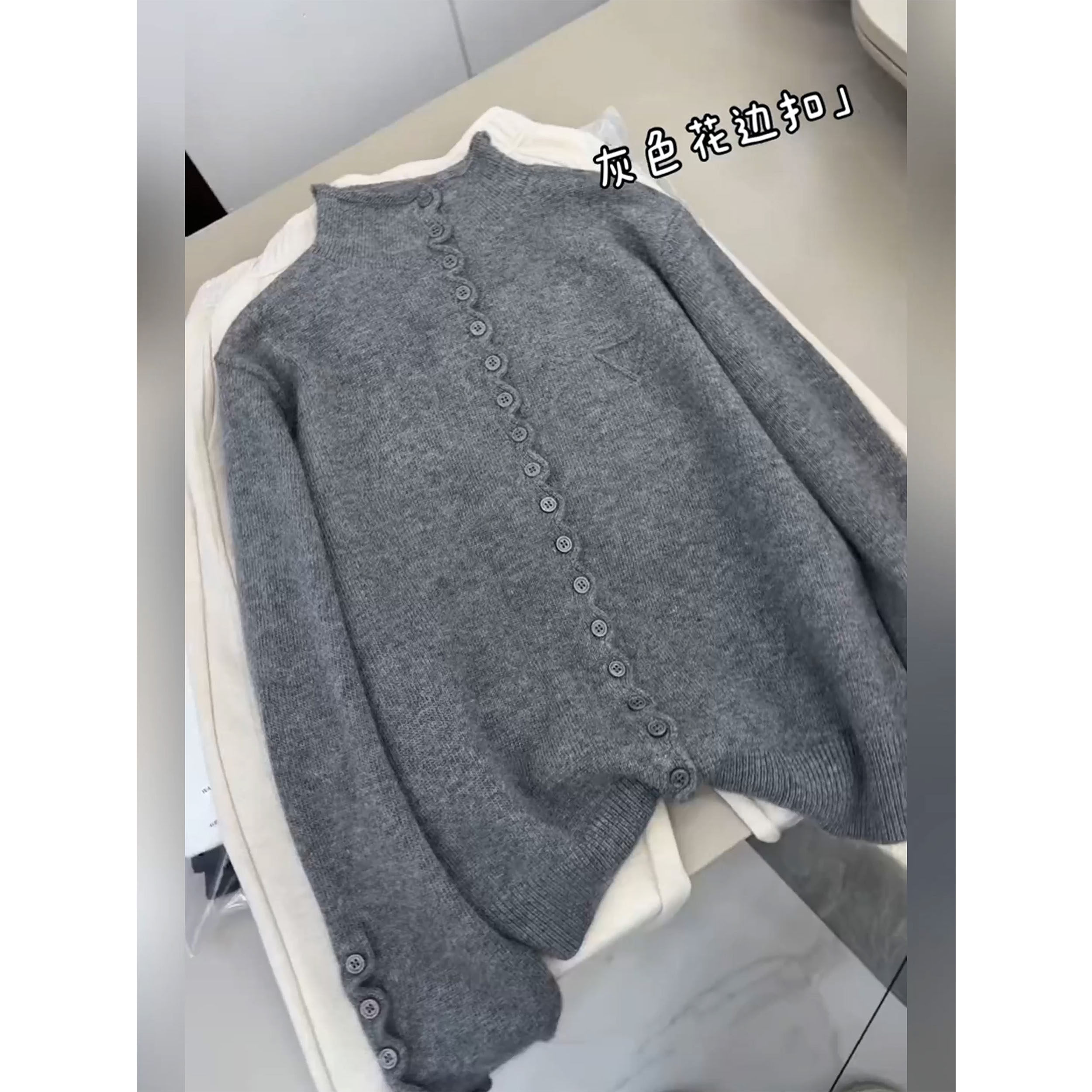 欧洲站时尚半高领灰色花边扣毛衣女秋冬软糯慵懒软糯显瘦针织开衫