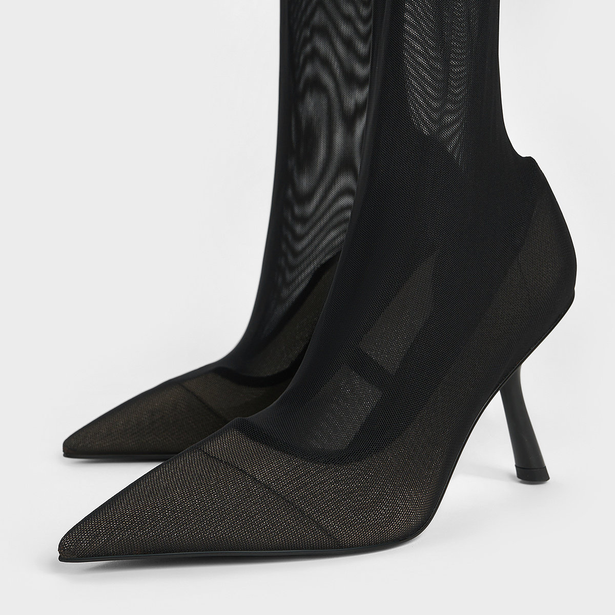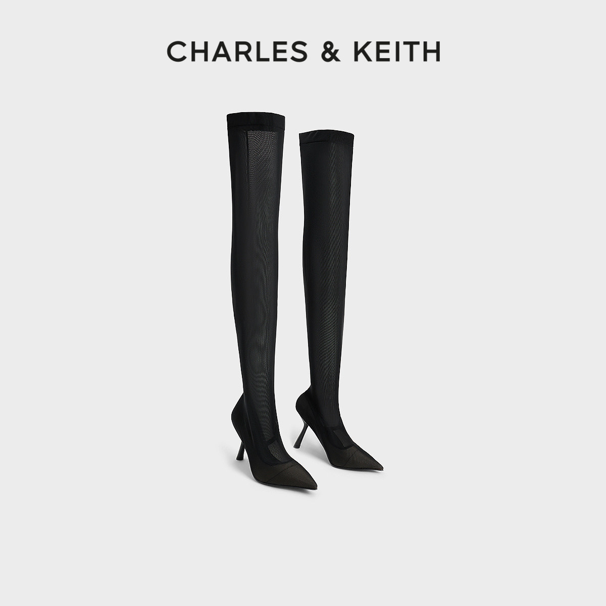CHARLES&KEITH秋冬女鞋CK1-90280056时尚网纱高筒尖头过膝袜靴