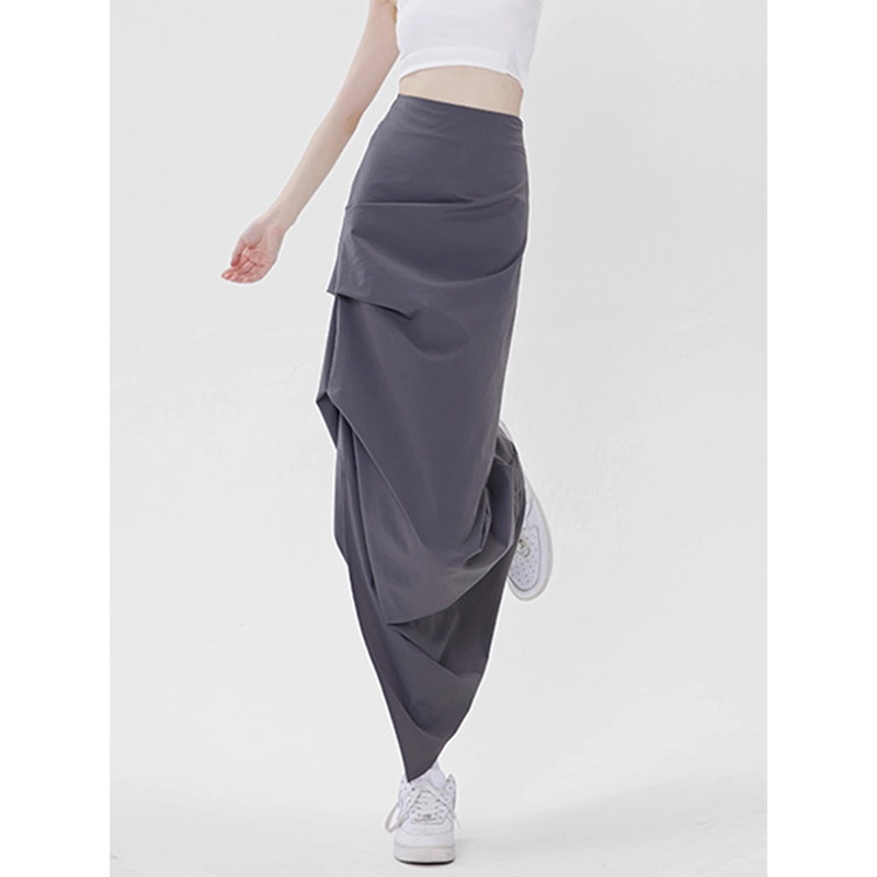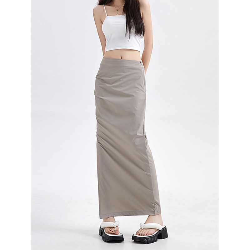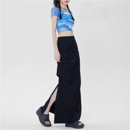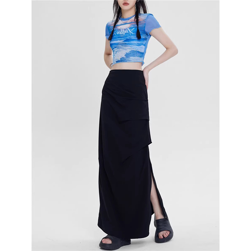 大码侧开叉工装半身裙女胖妹妹高腰显瘦mm修身设计感褶皱拖地长裙