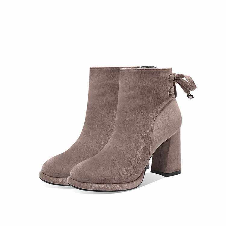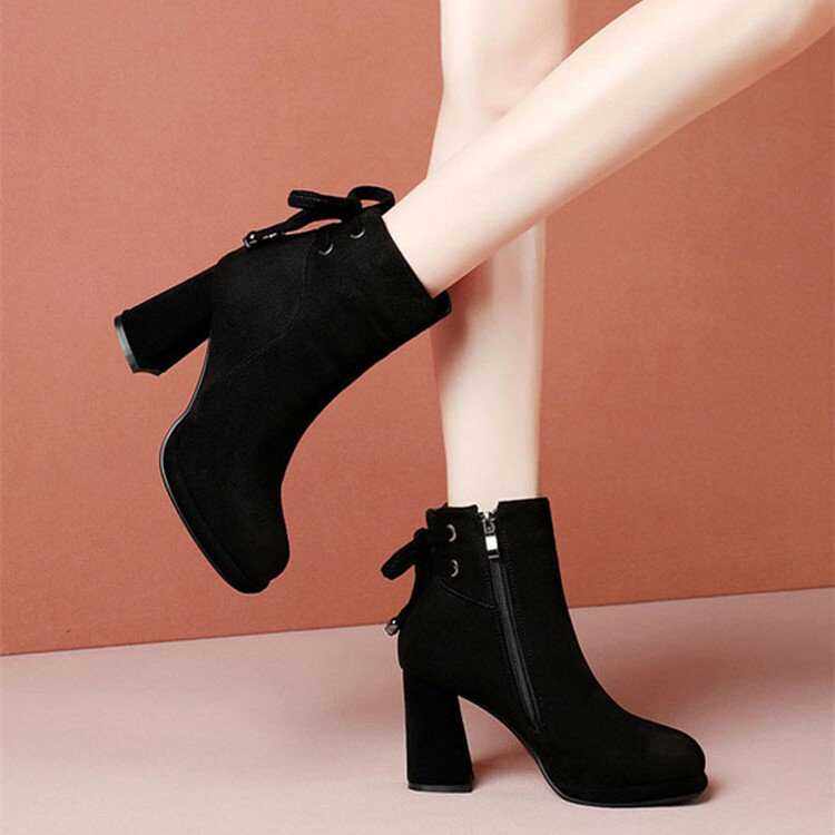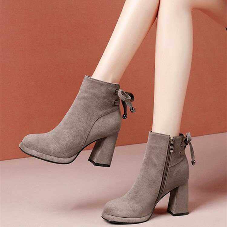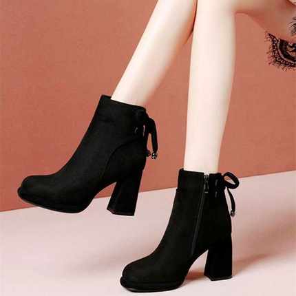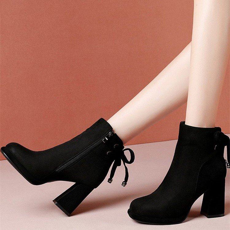高跟短靴女2024春秋冬新款蝴蝶结侧拉链绒面小短靴马丁靴粗跟单靴