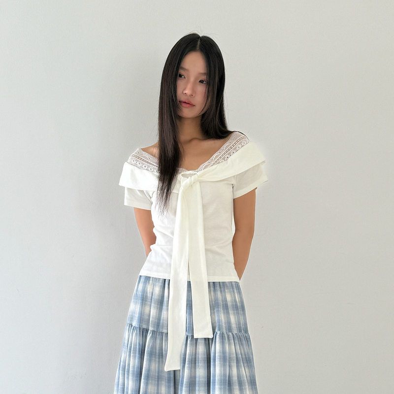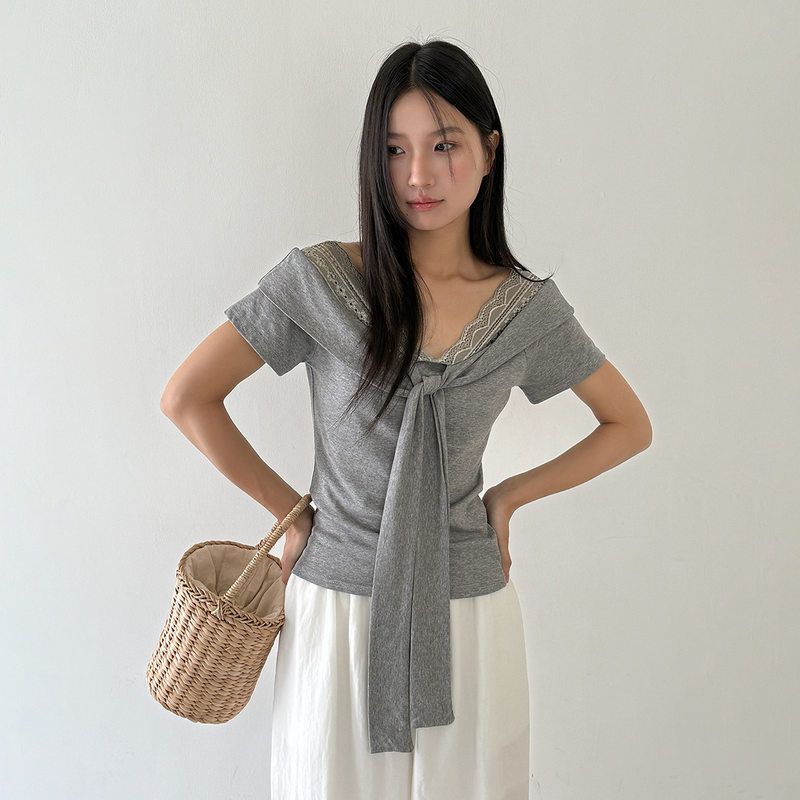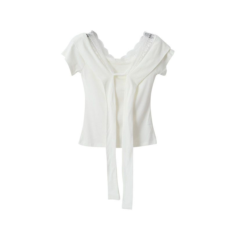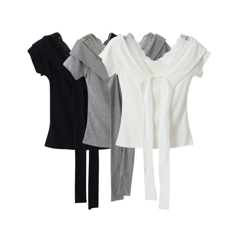 纯欲甜美v领/一字领蕾丝拼接蝴蝶结小衫显瘦短袖T恤3041 强明女装