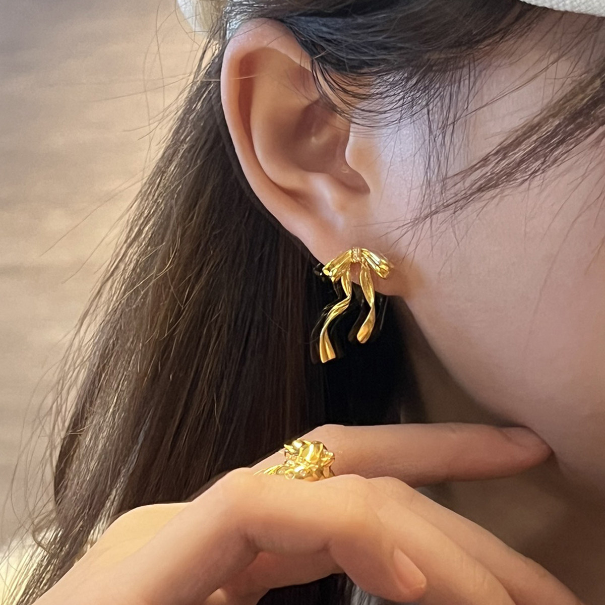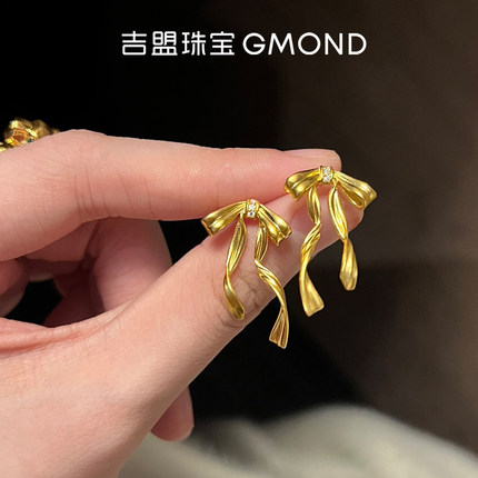 吉盟珠宝999足金点钻耳钉女黄金耳饰蝴蝶结丝带个性国风新中式