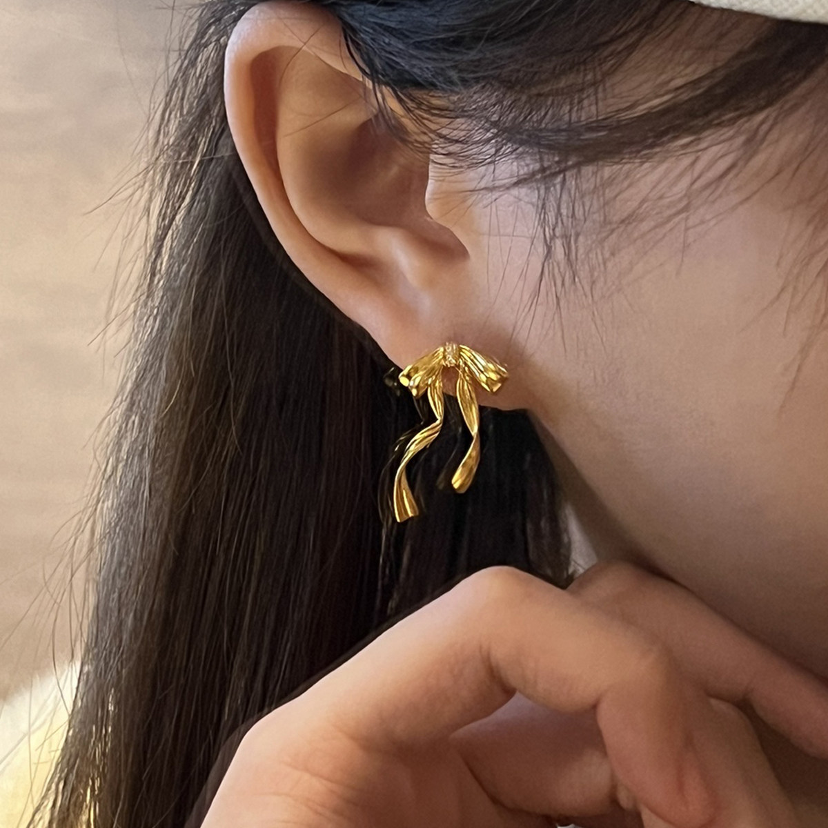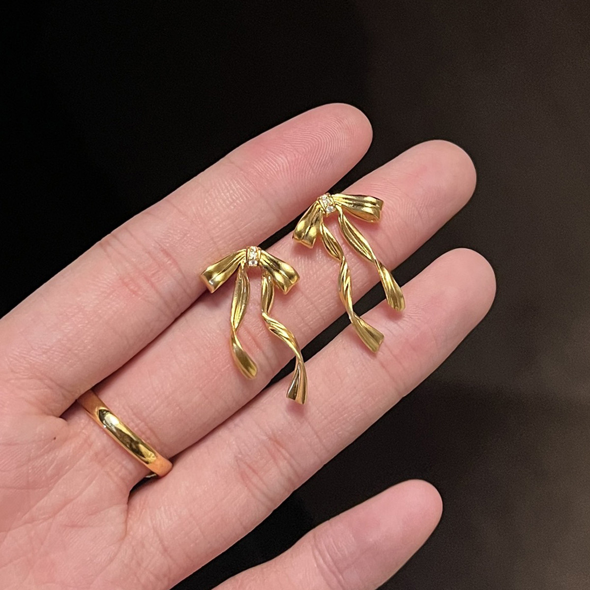 足金点钻耳钉黄金耳饰蝴蝶结丝带