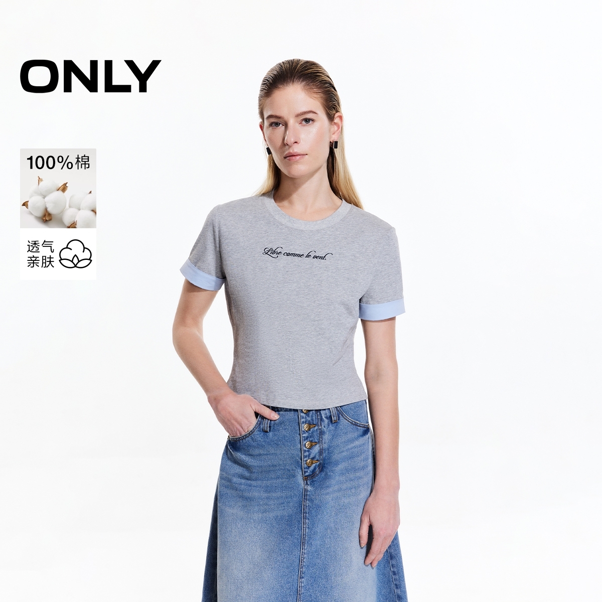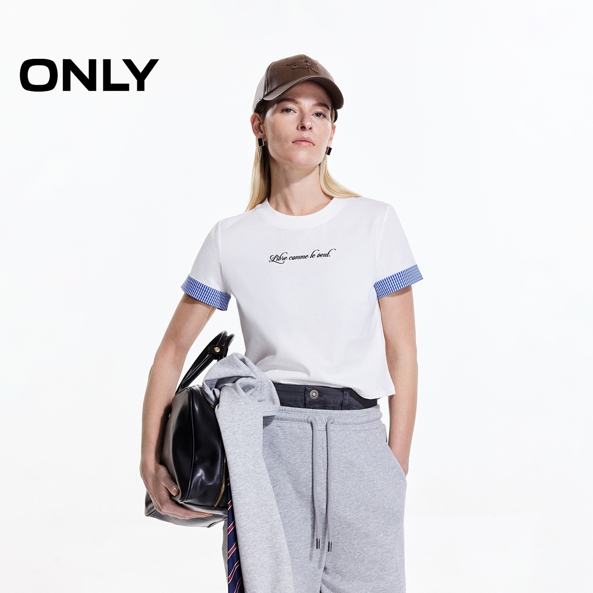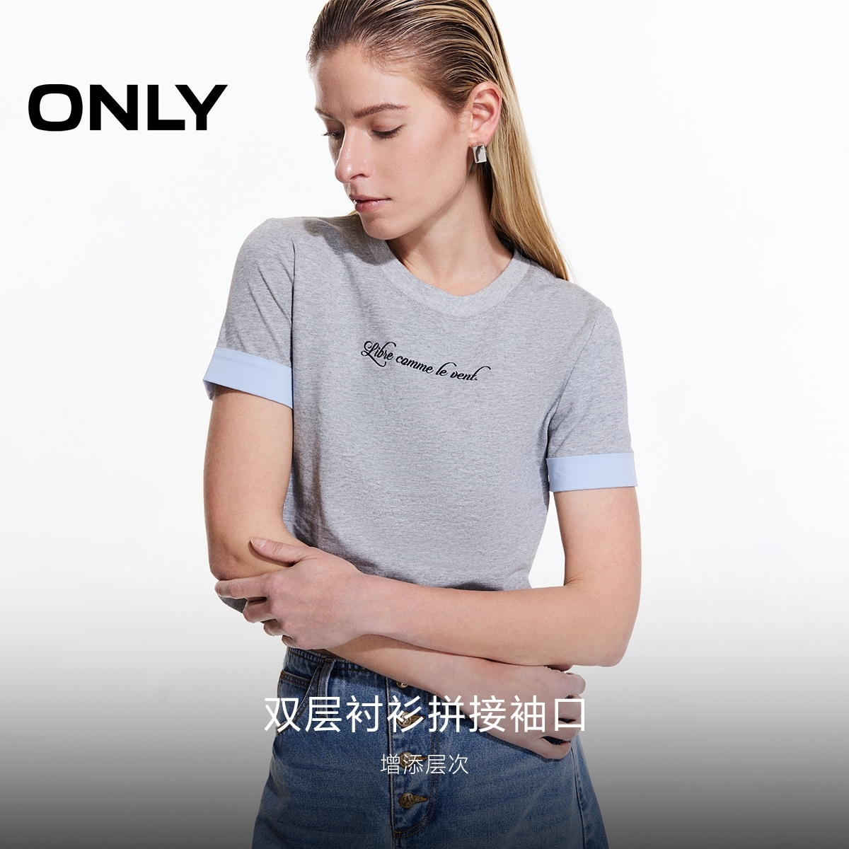 ONLY2025夏季新款随性学院风字母袖口拼接撞色正肩圆领短款T恤女