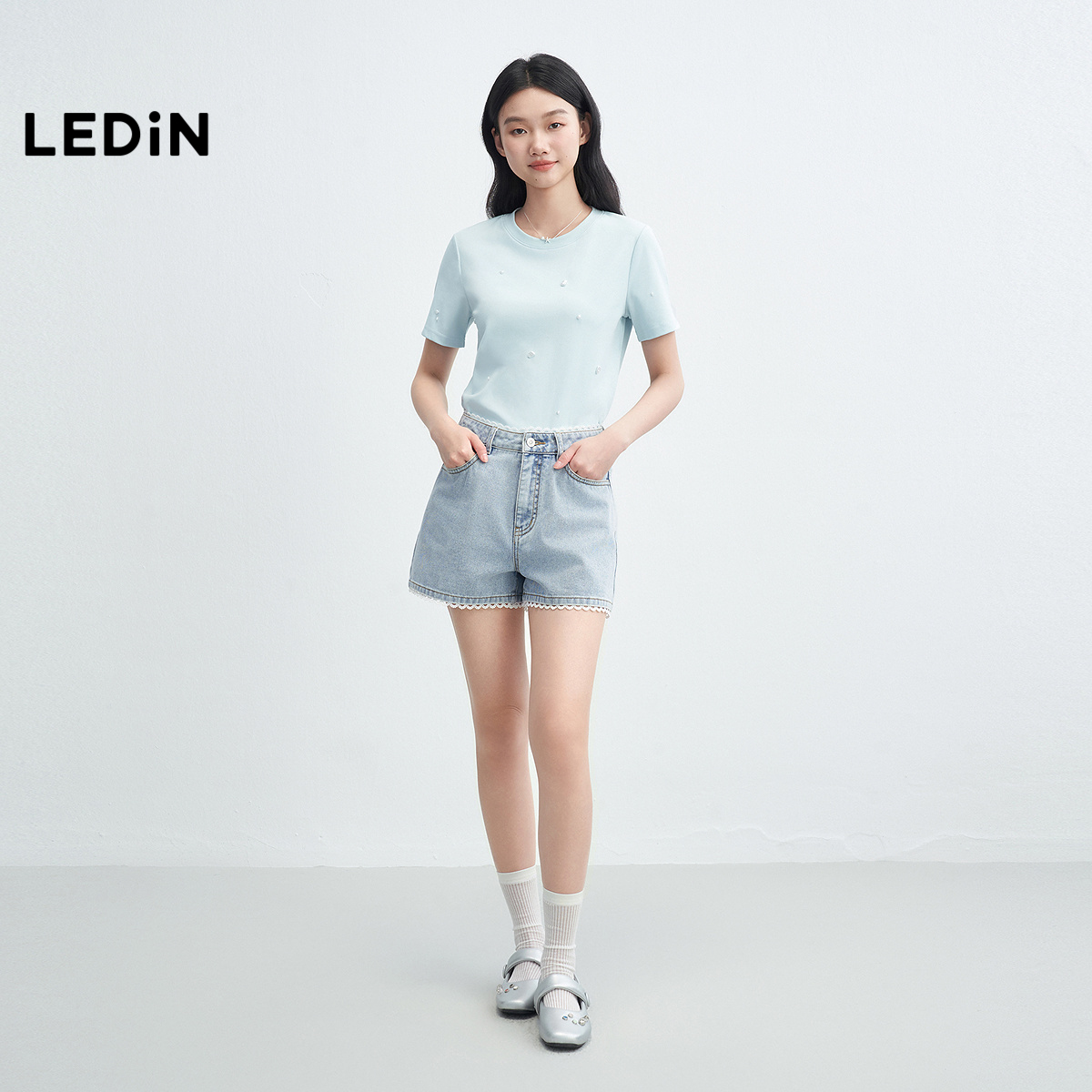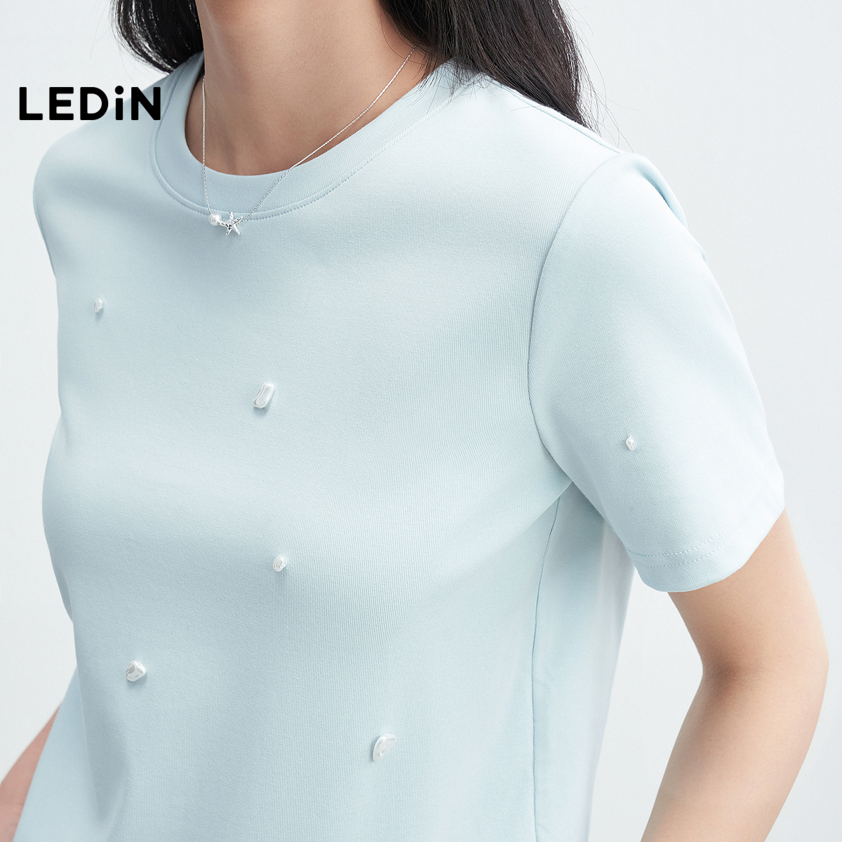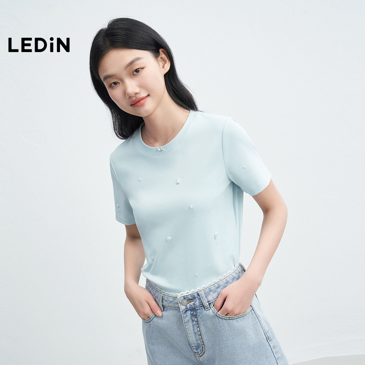 乐町手工珍珠蓝色T恤女装25年夏季新款甜美气质上衣圆领合体短袖