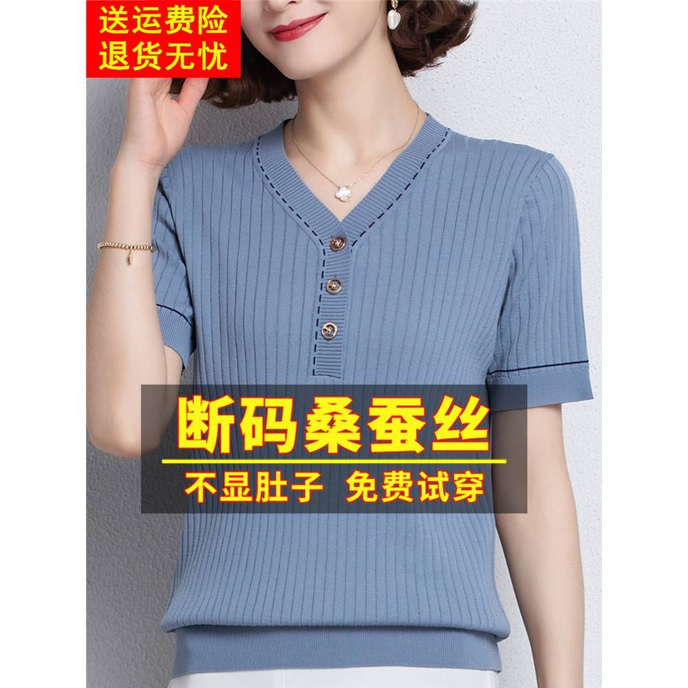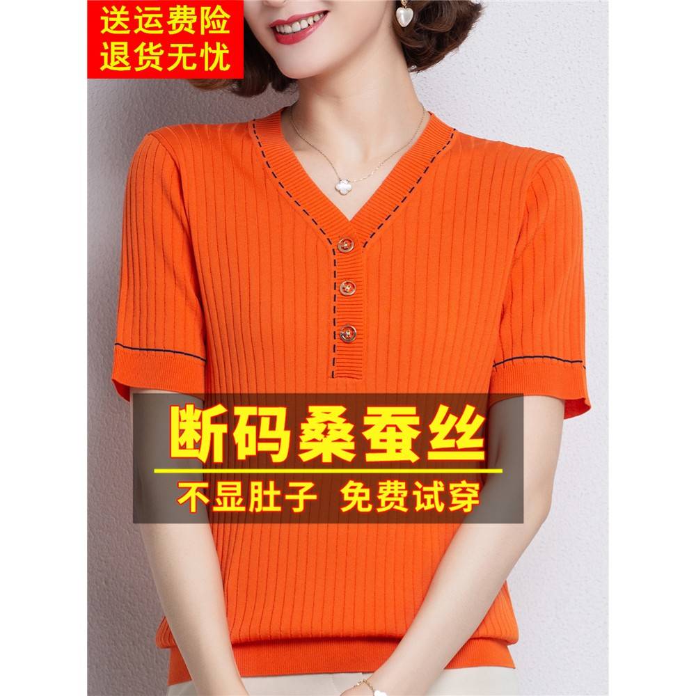 夏装新款桑蚕丝t恤女2024年v领冰丝短袖宽松妈妈漂亮大牌真丝上衣