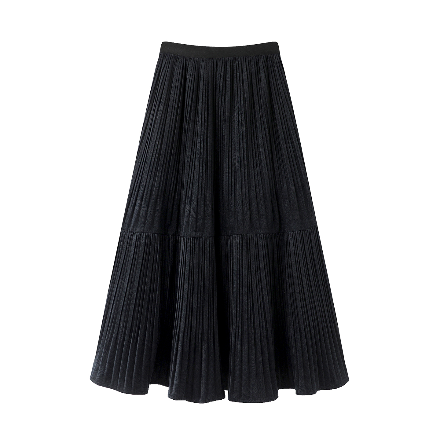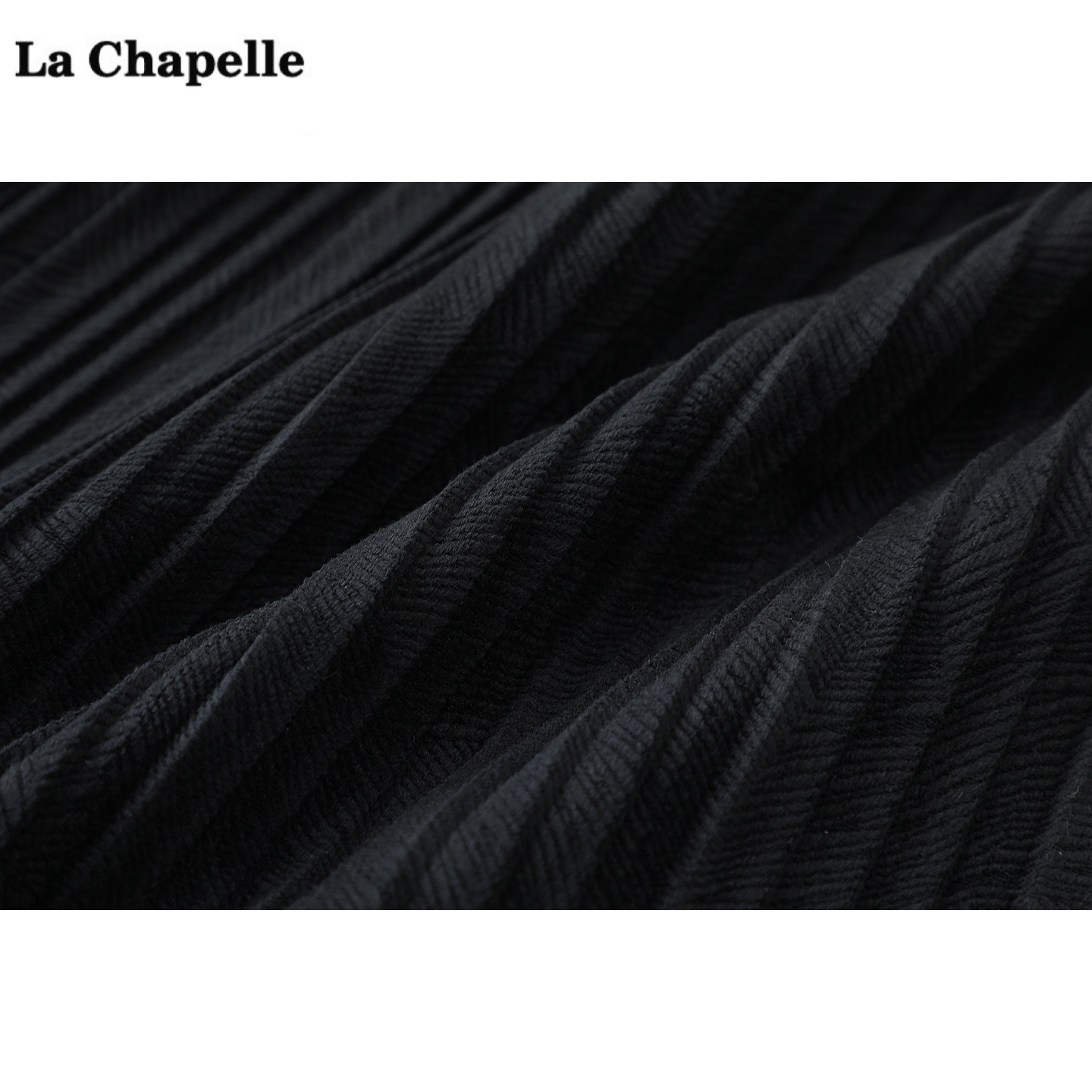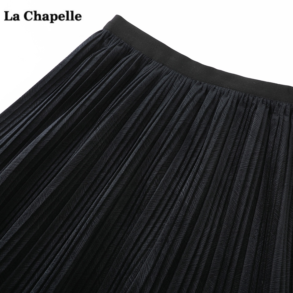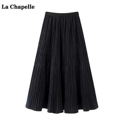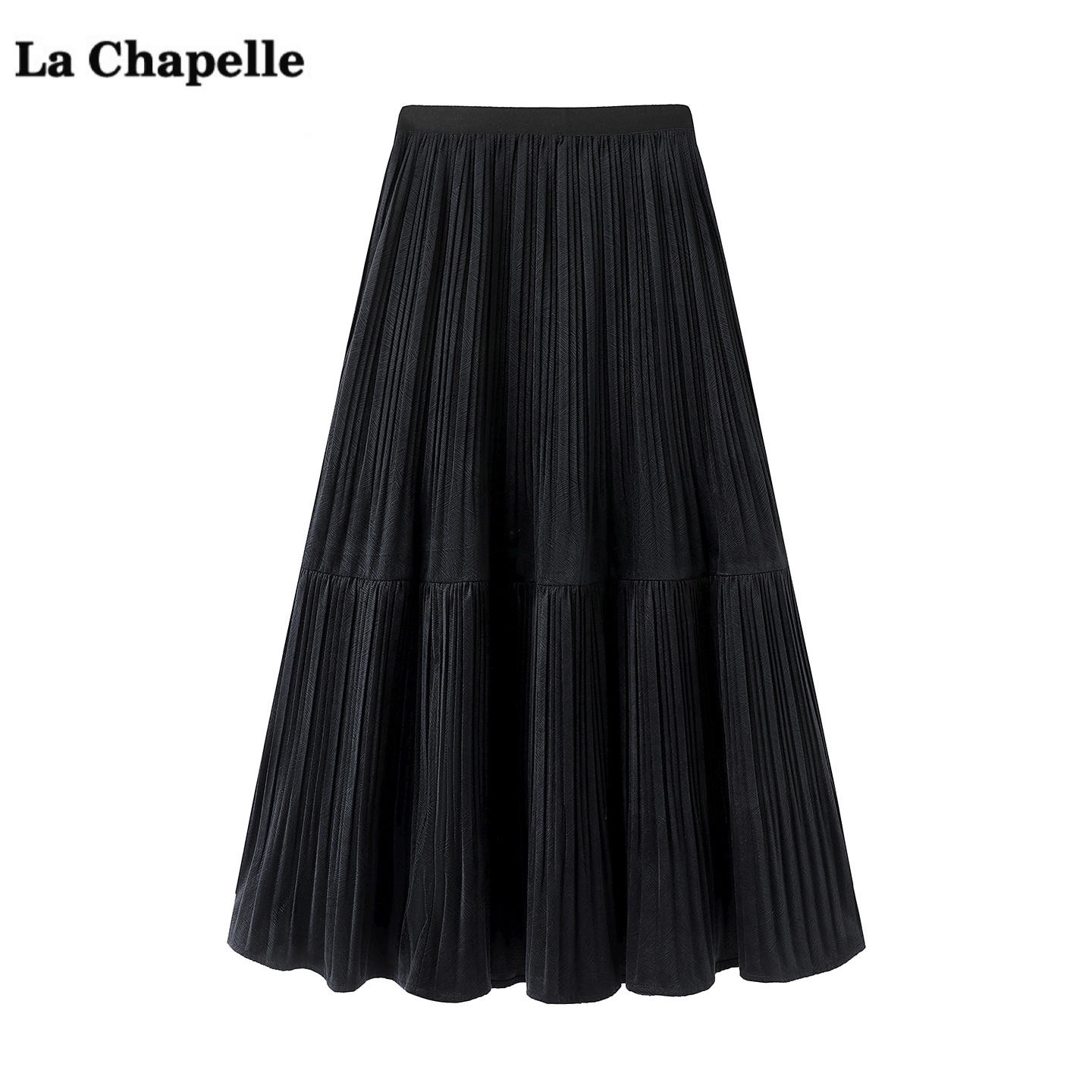 拉夏贝尔/La Chapelle黑色百褶半身裙女冬季季赫本风中长款a字裙
