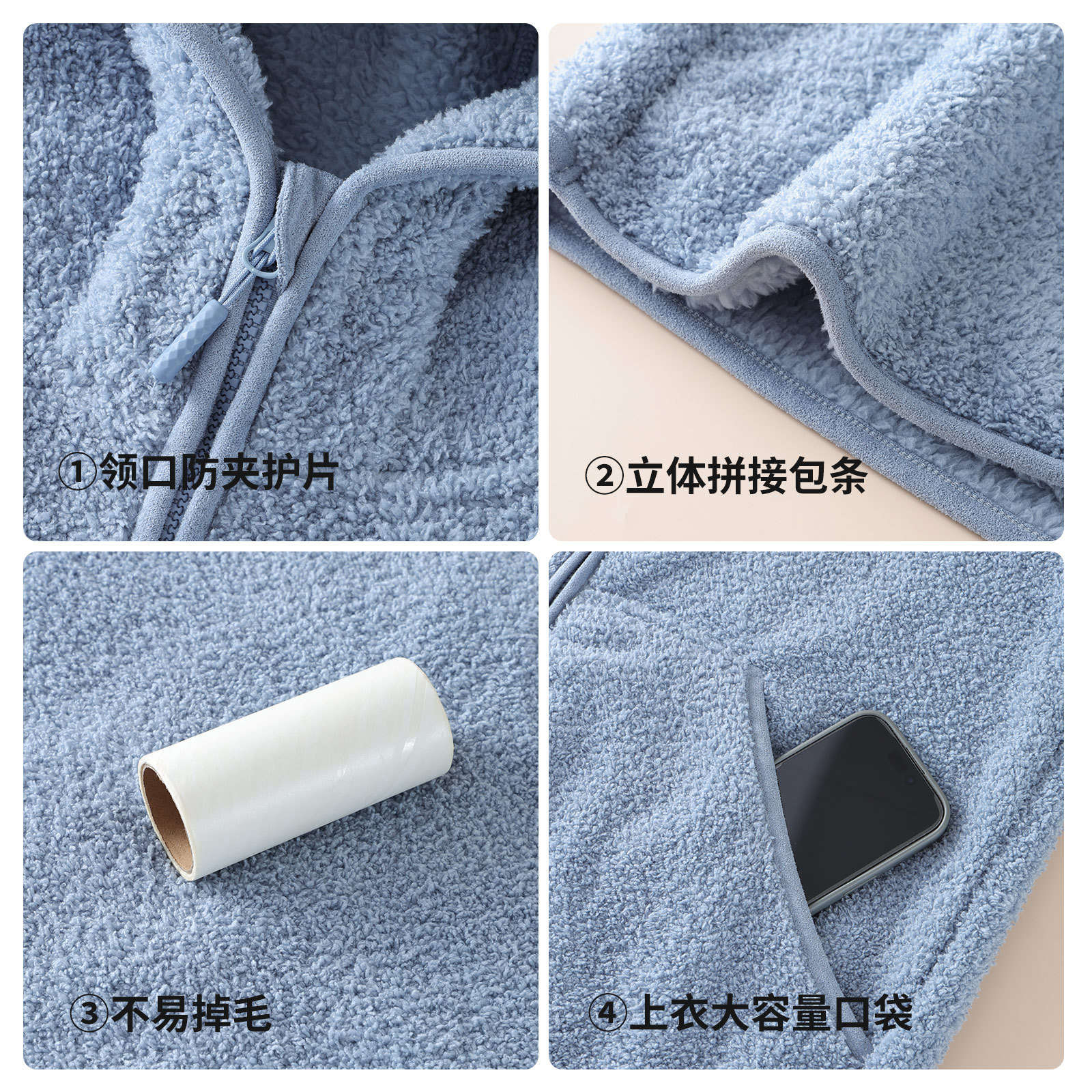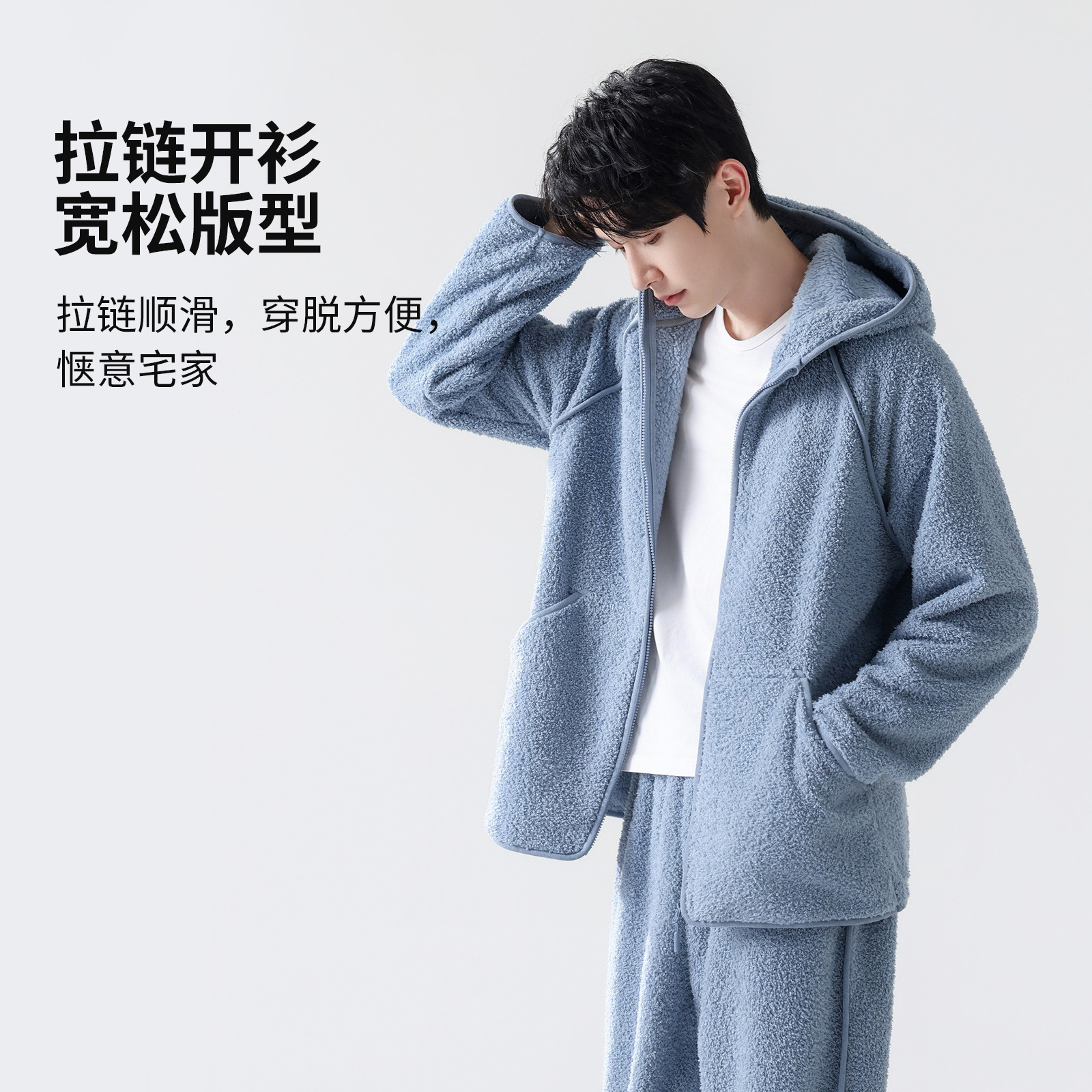 猫人男士睡衣半边绒秋冬男款家居服两件套连帽加绒加厚冬季可外穿