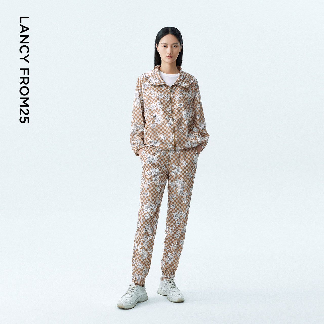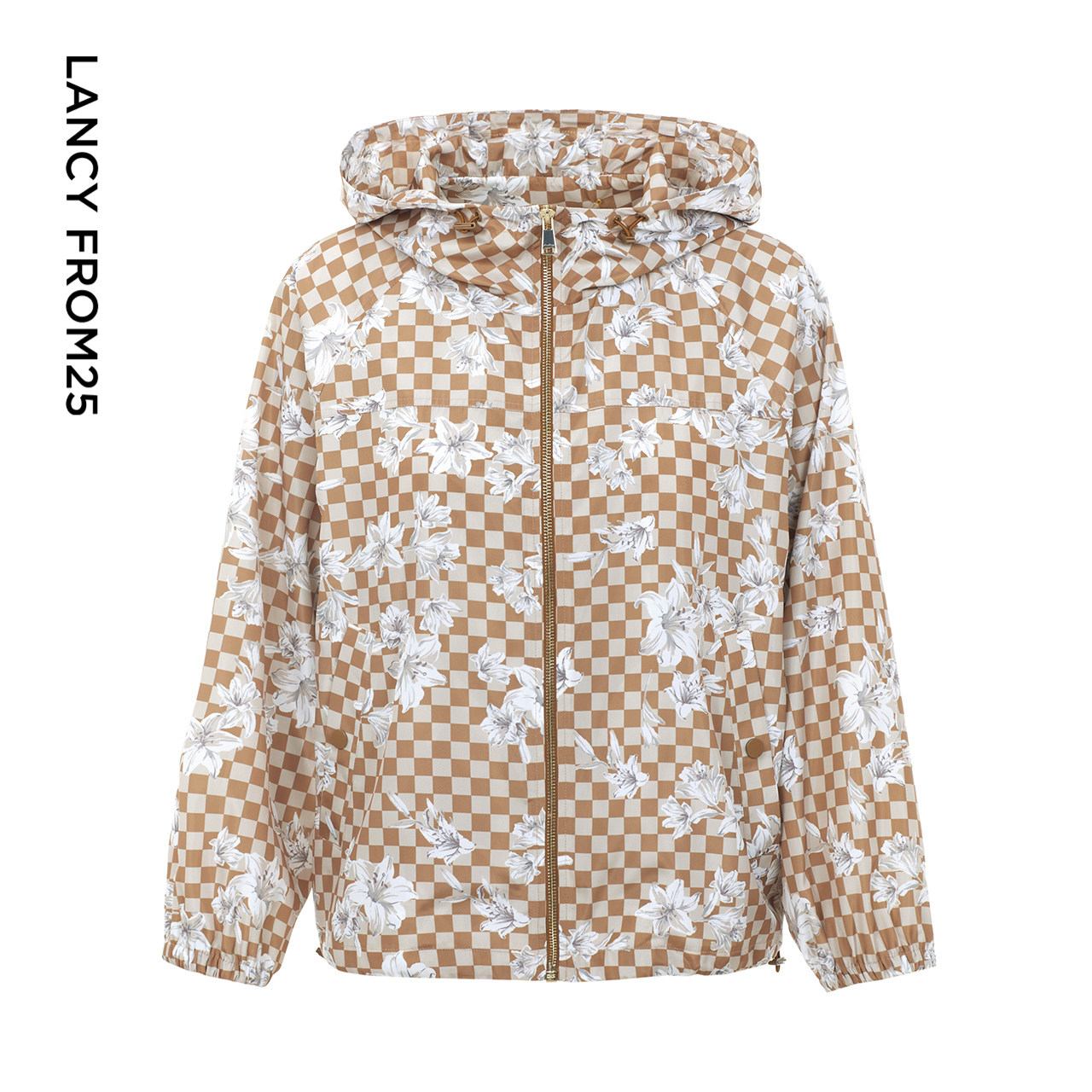 LANCY/朗姿2023秋季新款休闲女士连帽短外套女格纹植物印花长袖