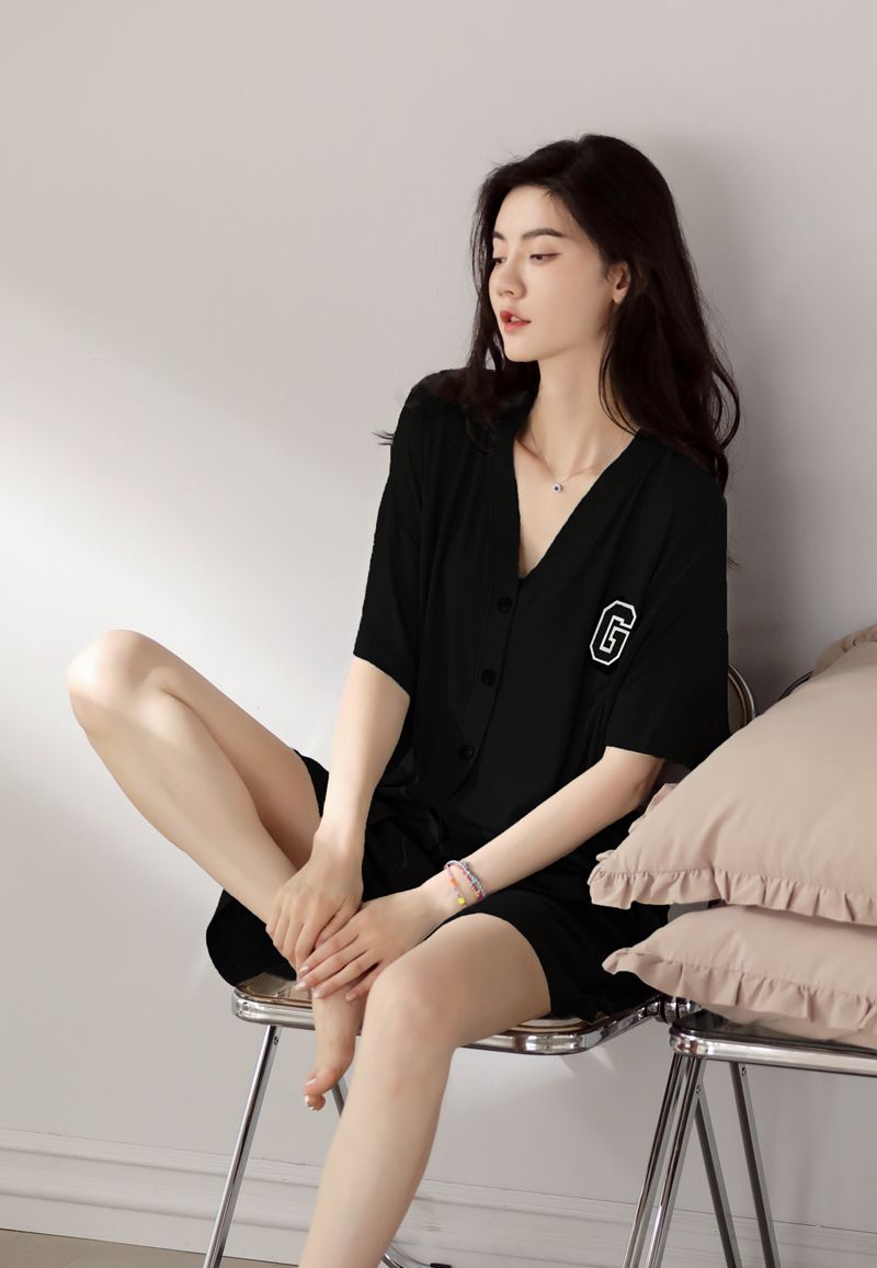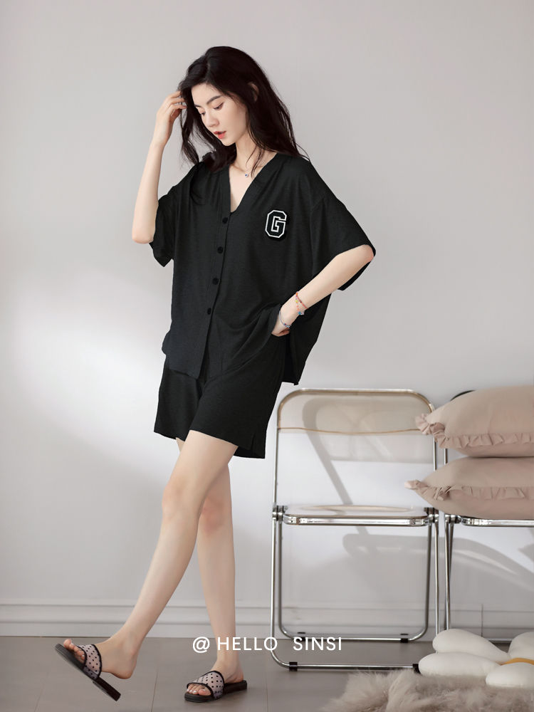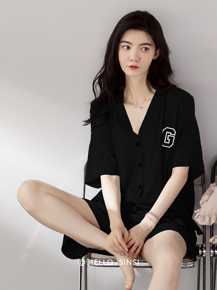 大码300斤睡衣女夏季短袖短裤薄款开衫黑色时尚可外穿家居服套装