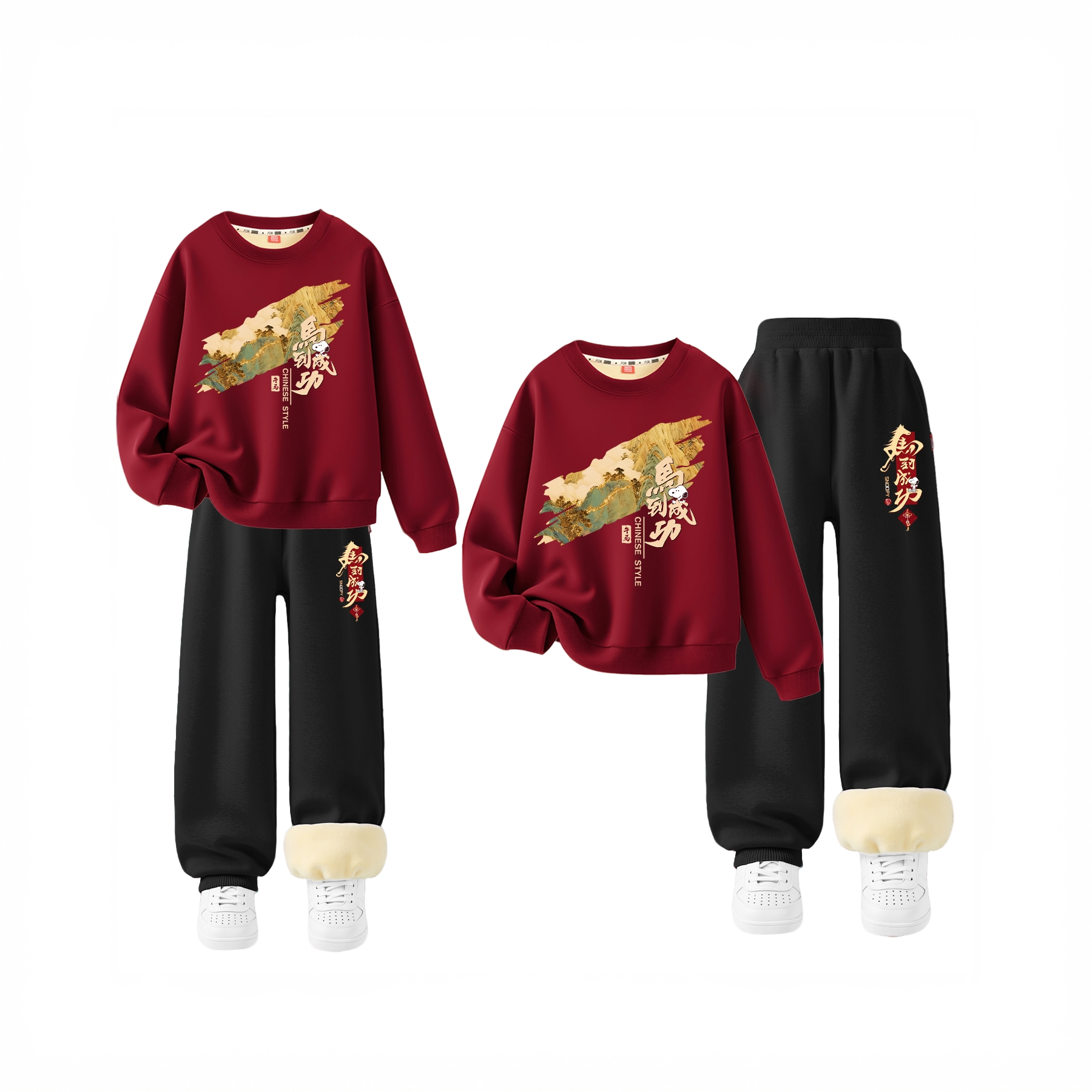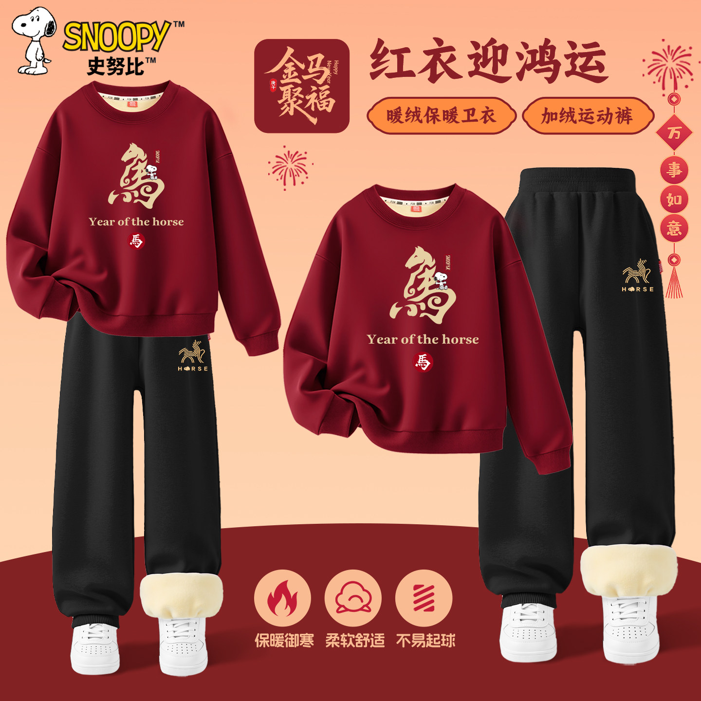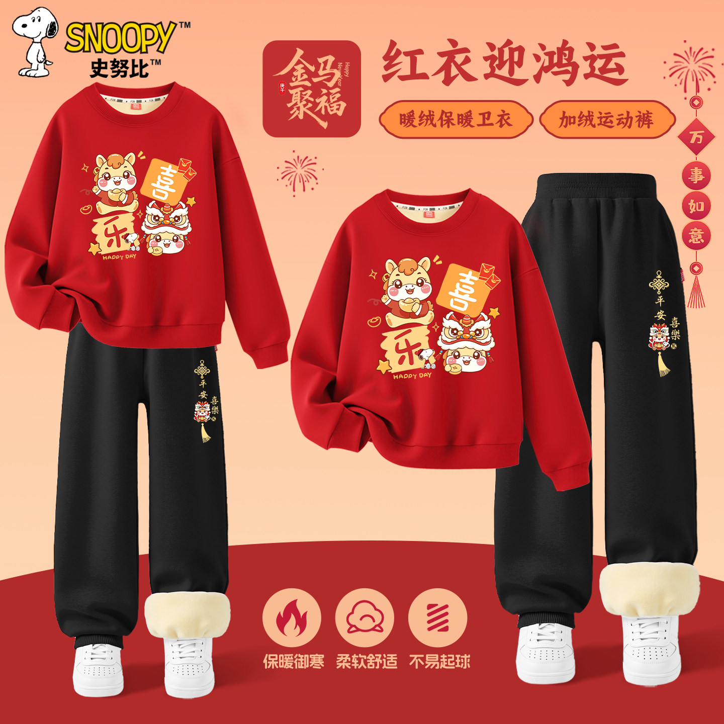 史努比男童加绒套装2026新款新年红色星期大童拜年服男童冬装卫衣