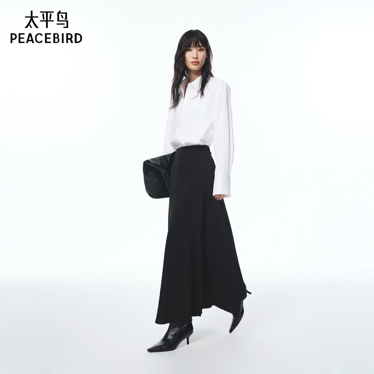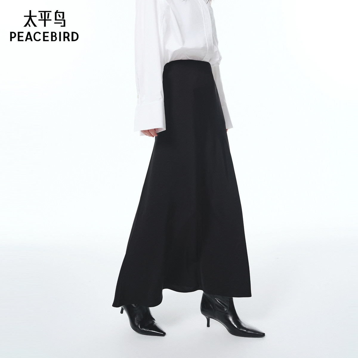 太平鸟顺滑醋酸黑色通勤半身长伞裙25新款A1GFF3347