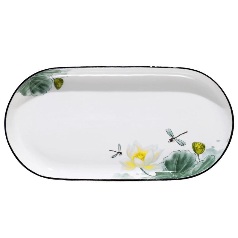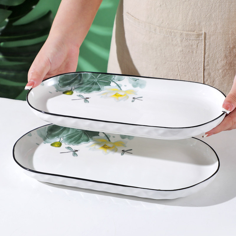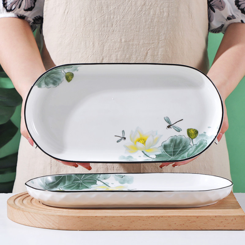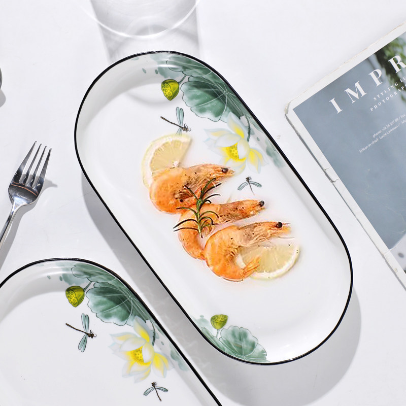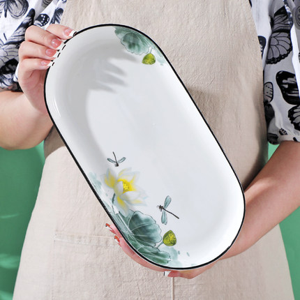 鱼盘陶瓷家用椭圆形荷花12英寸