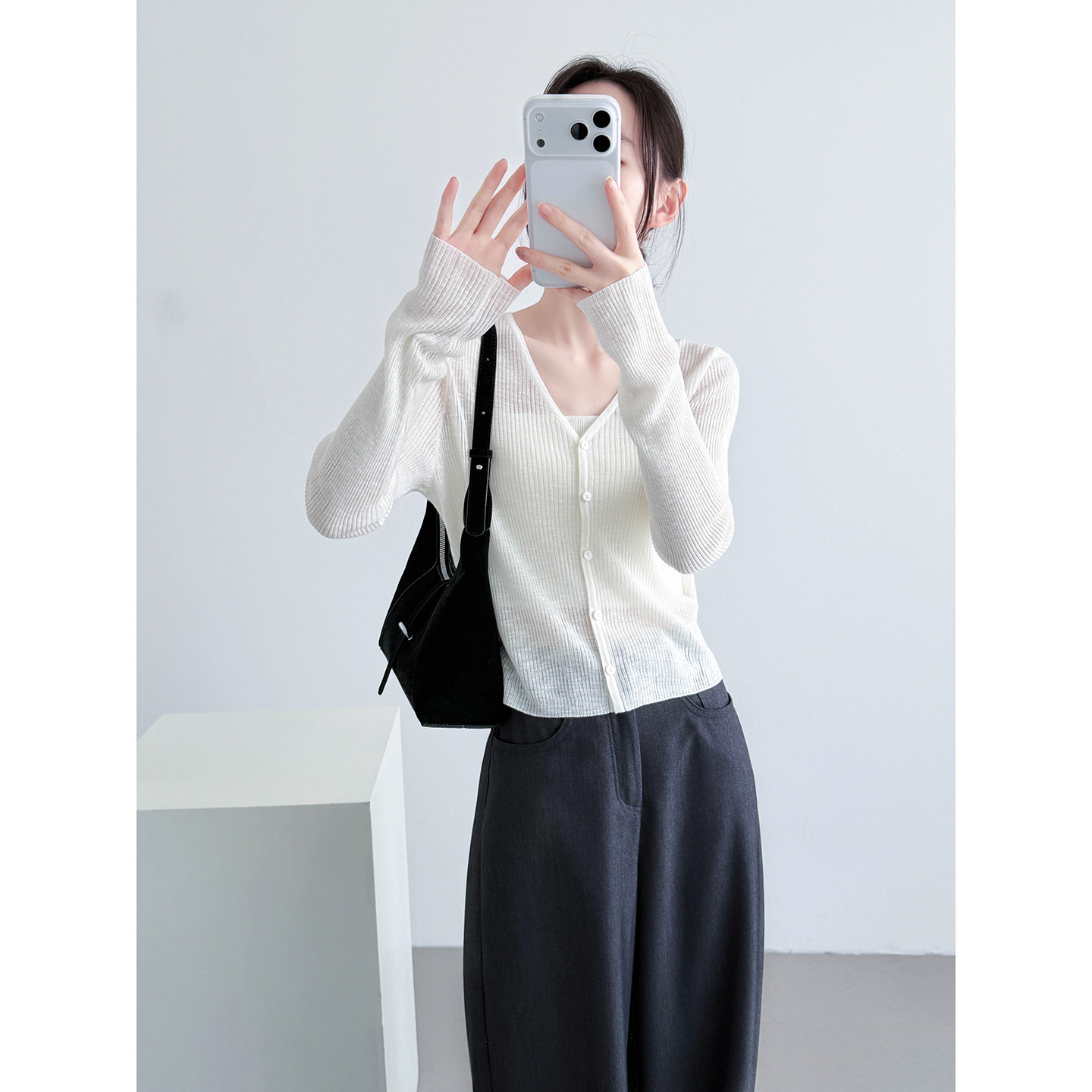 白色亚麻针织开衫女2026新款显瘦配吊带裙外搭薄款V领防晒空调衫