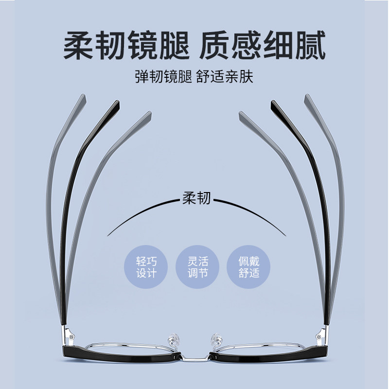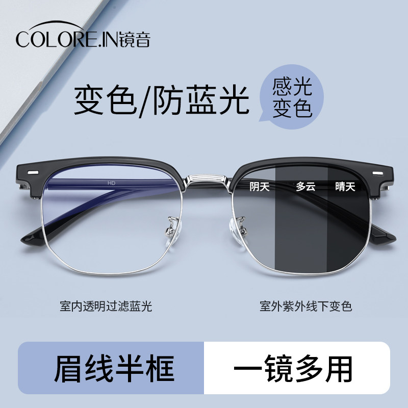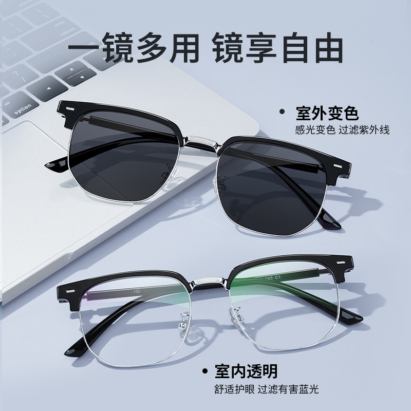 自动感光变色半框近视眼镜男可配度数抗防蓝光辐射疲劳平光眼睛架