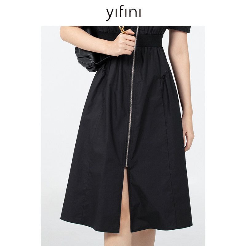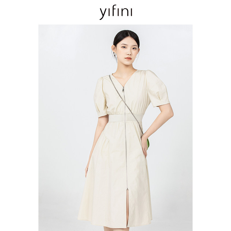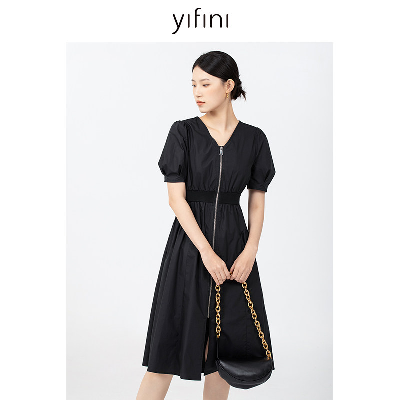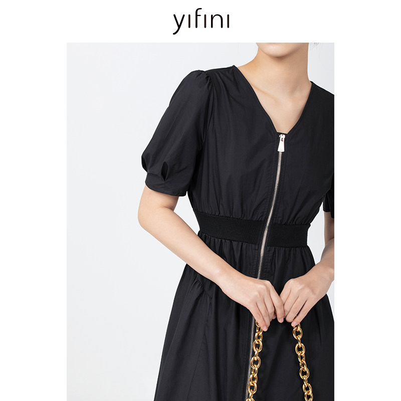 Yifini/易菲收腰显瘦气质V领短袖纯棉连衣裙女初秋新款茶歇裙
