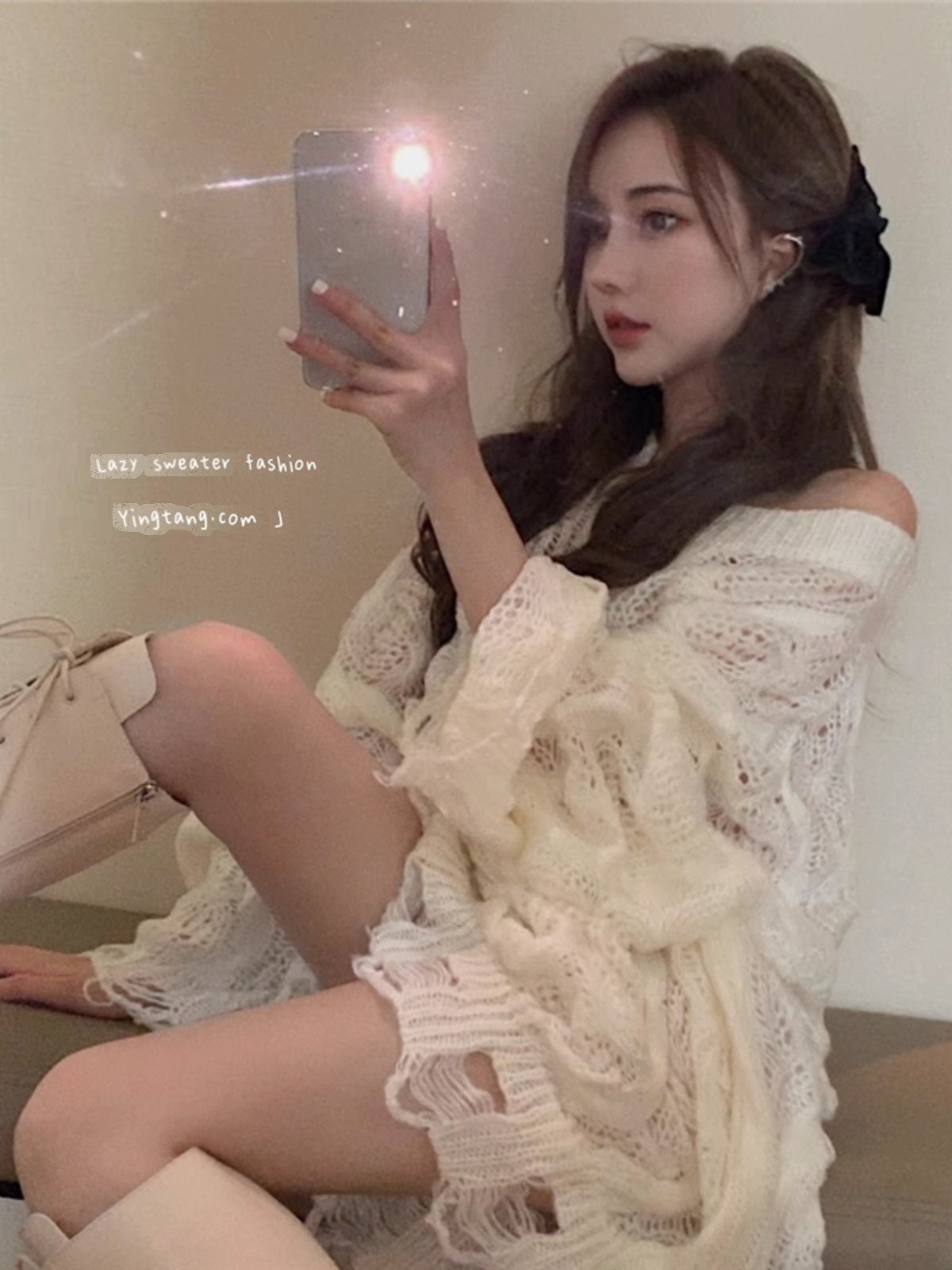 宽松麻花针织衫外套女秋冬镂空露肩纯欲白色oversize大毛衣慵懒风