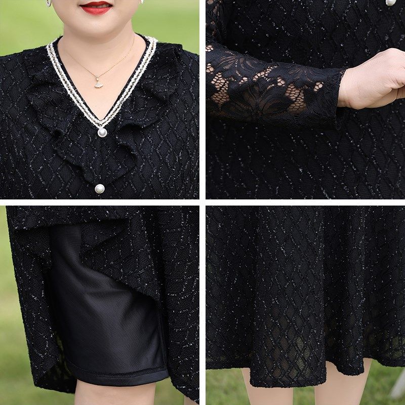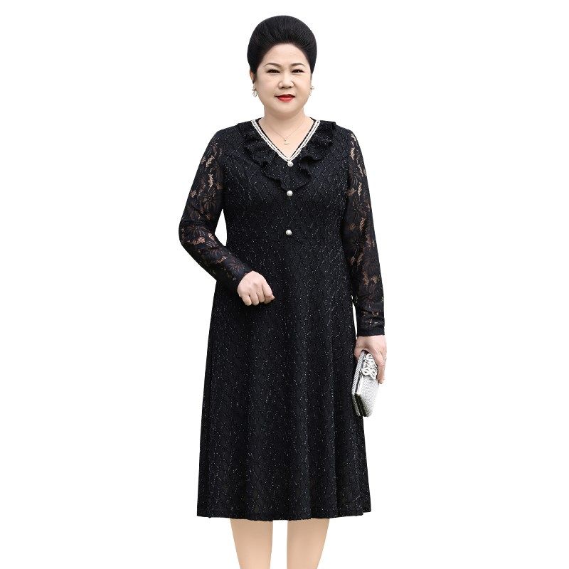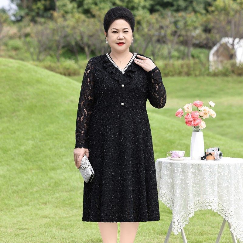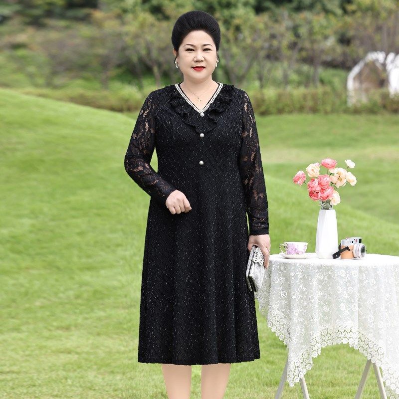 速发高贵蕾气裙子妈妈春装新款洋丝码大特中老年装黑色连衣裙
