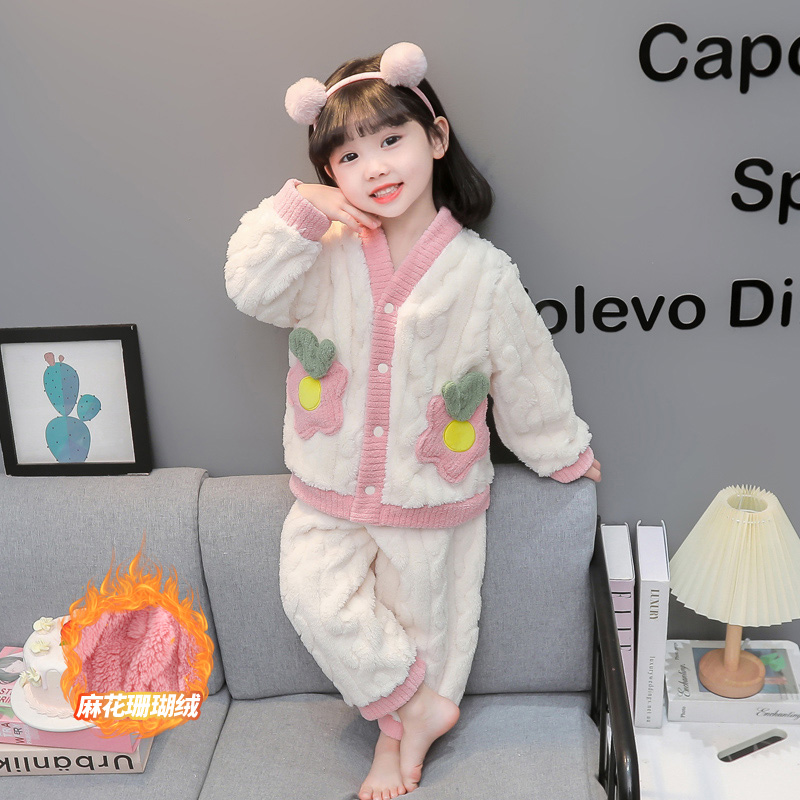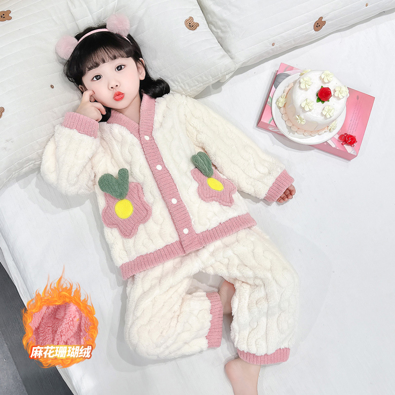 女童珊瑚绒睡衣秋冬儿童开衫保暖家居服分体套装女孩法兰绒加厚冬
