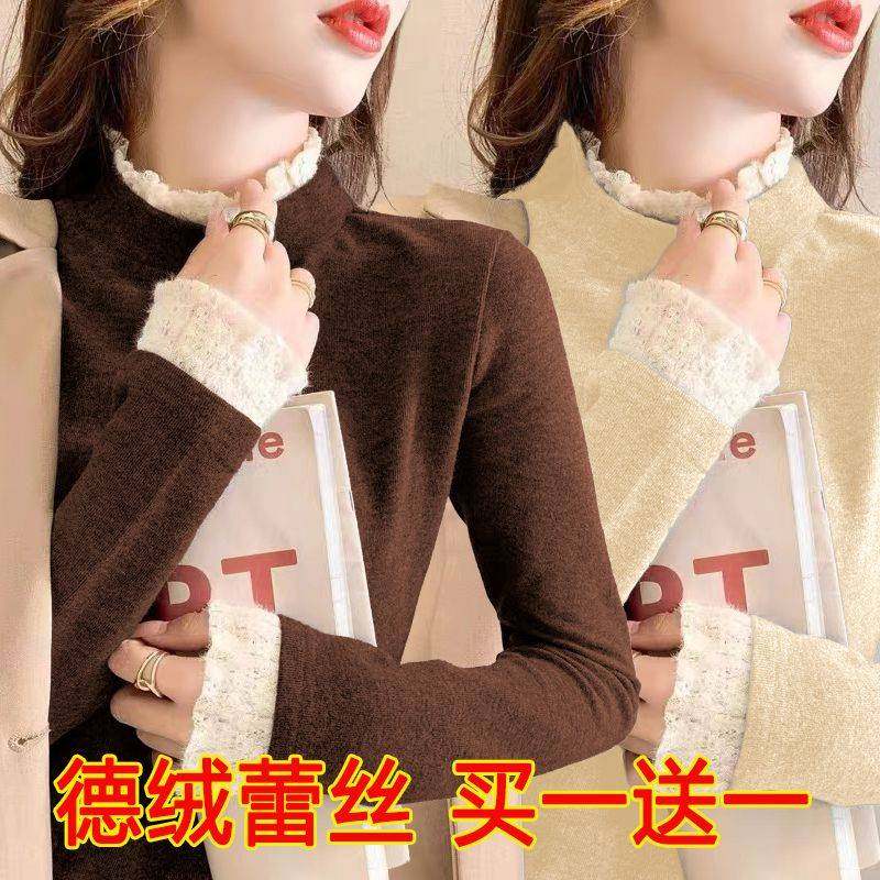 单/两件 德绒蕾丝领半高领打底衫女2022春秋冬季新款长袖内搭上衣