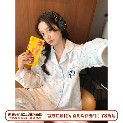 馨帮帮Homedress 卡通企鹅星星夹棉睡衣女秋季长袖学生家居服套装