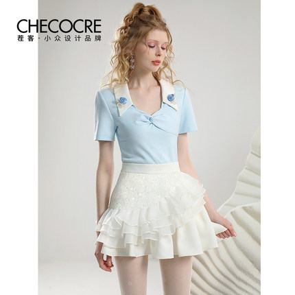 茬客浪漫减龄蓝白短裙短袖套装