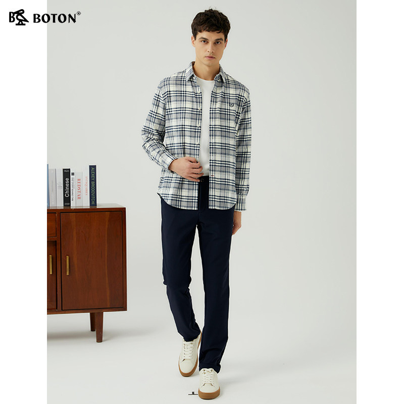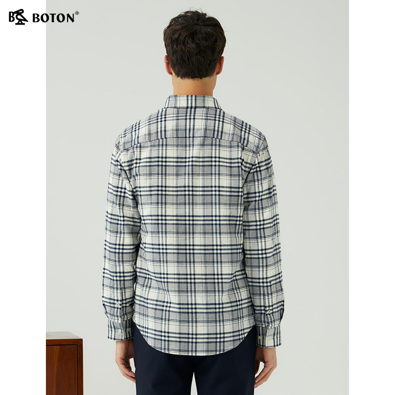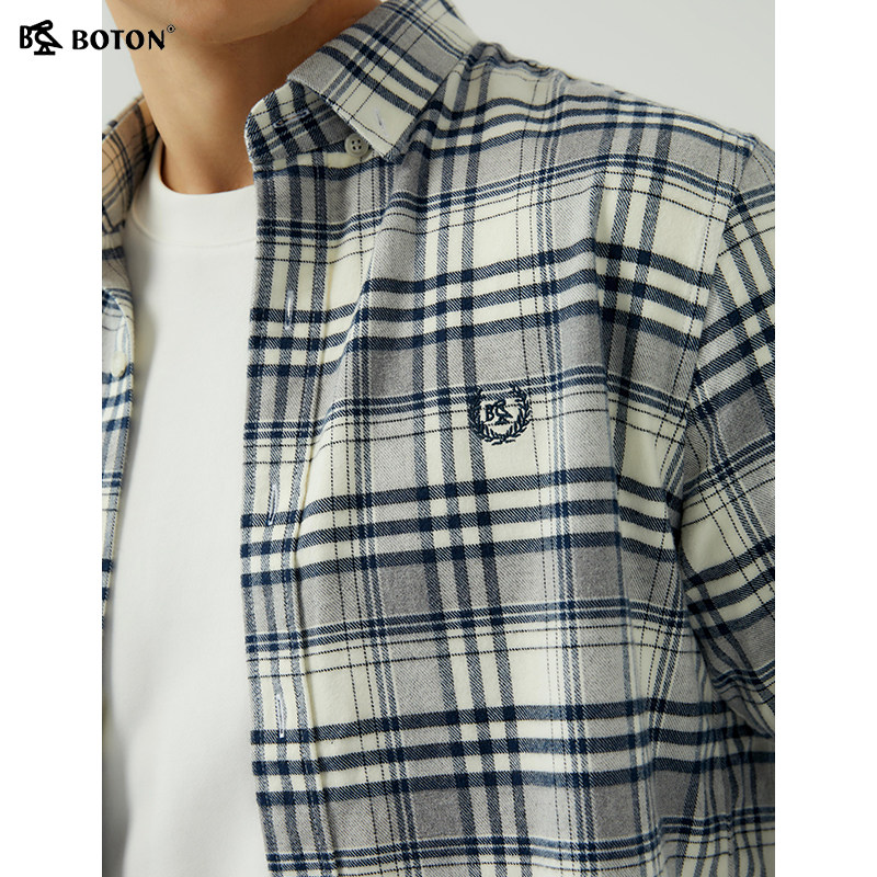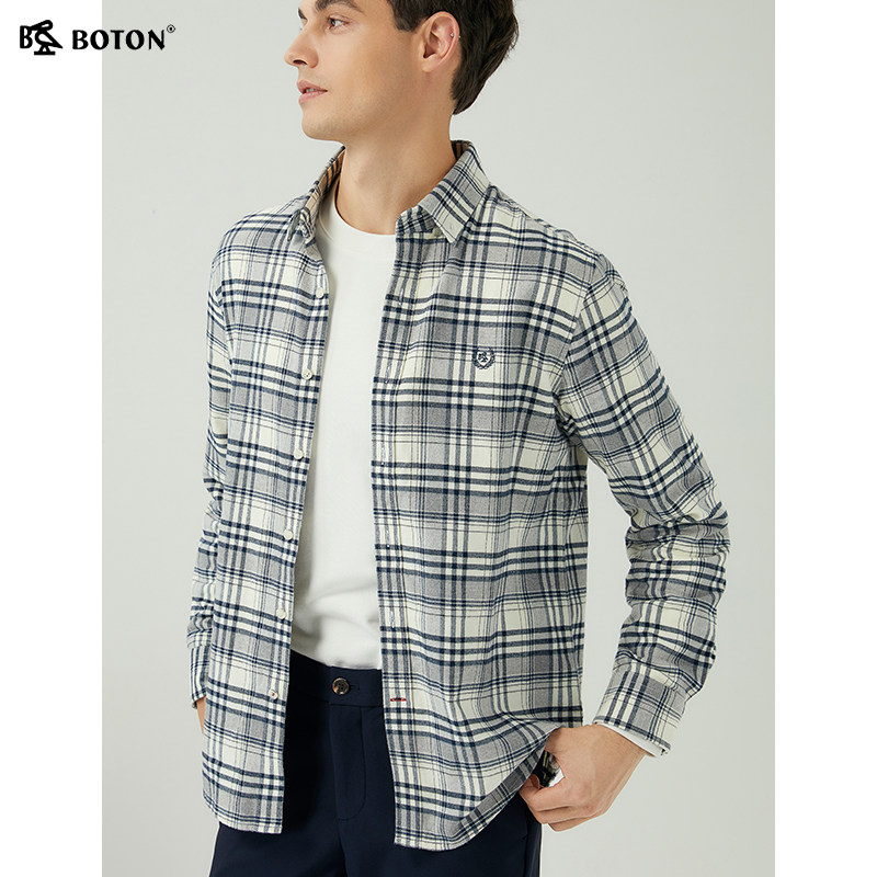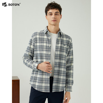 波顿长袖蓝白色格子衫2025秋冬季新款纯棉男士美式休闲高端衬衣