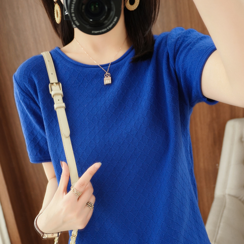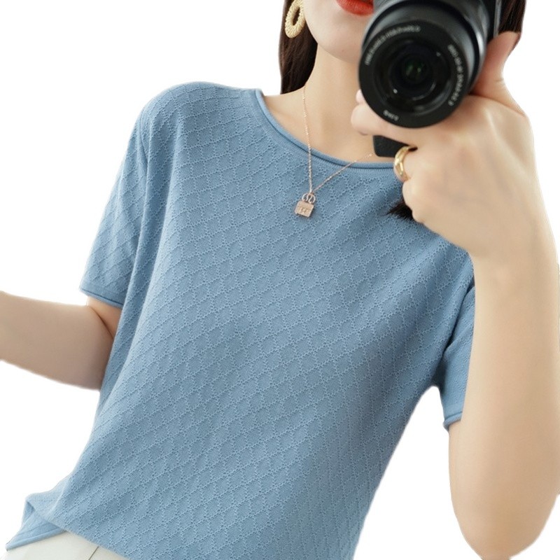 夏季新款100%纯棉圆领女针织短袖卷边镂空菱形宽松大码显瘦半袖