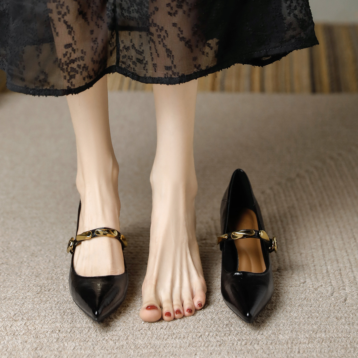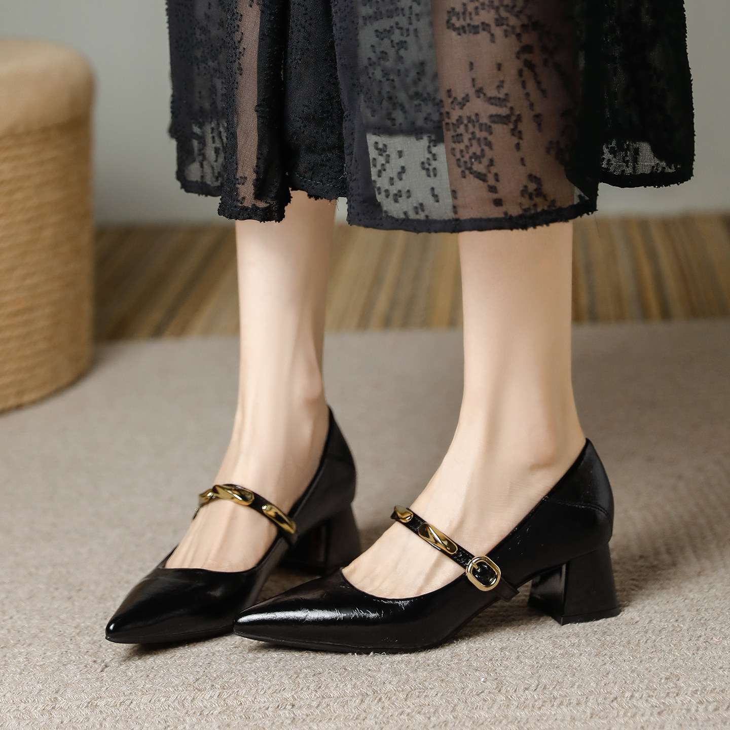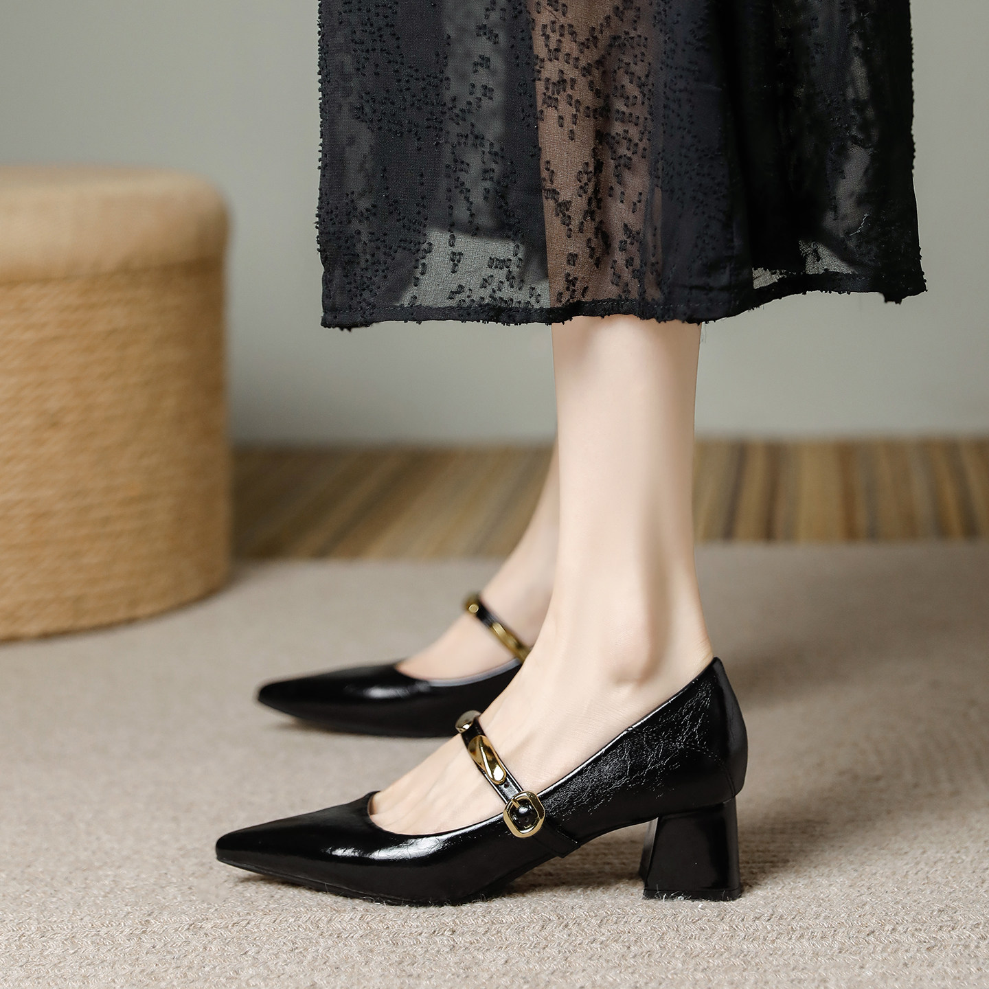 羊皮版~软皮尖头粗跟中跟5厘米浅口高跟单鞋2026春新款不累脚配裙