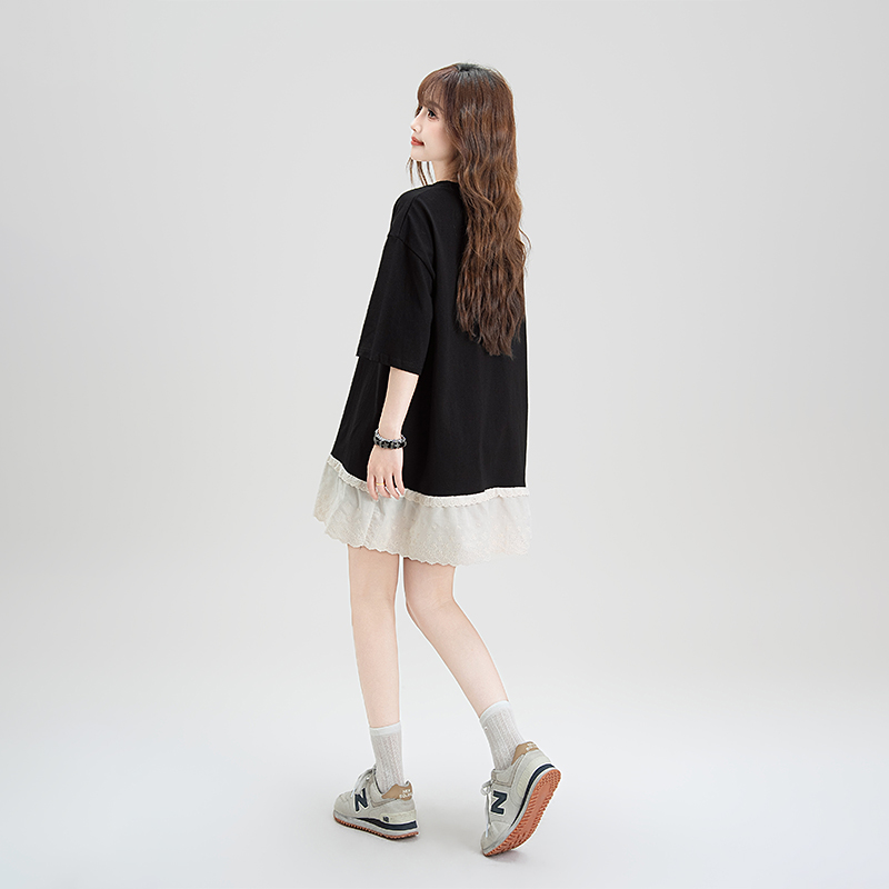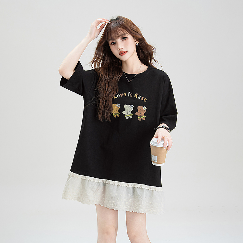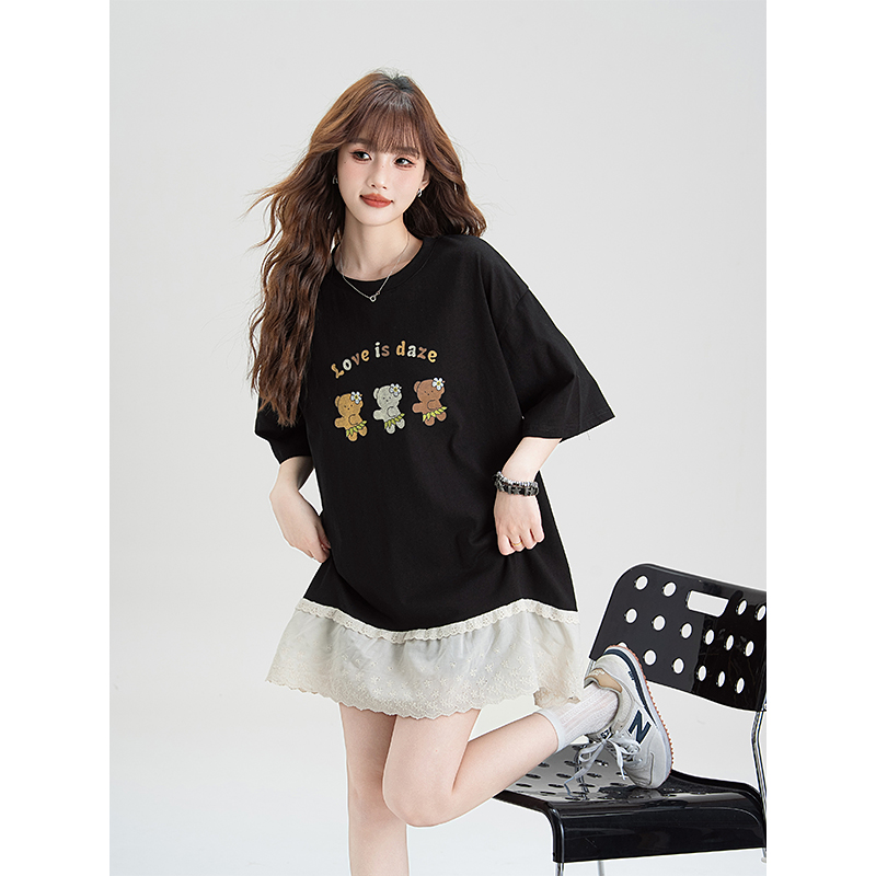 黑色可爱卡通印花短袖T恤女夏季新款蕾丝拼接设计感百搭显瘦上衣