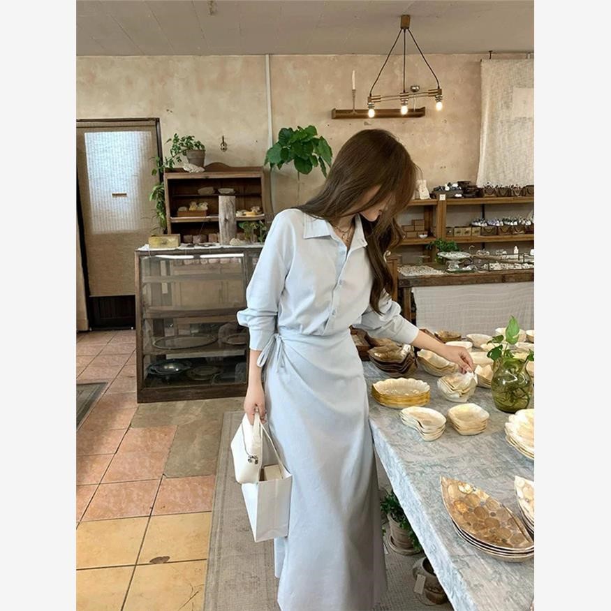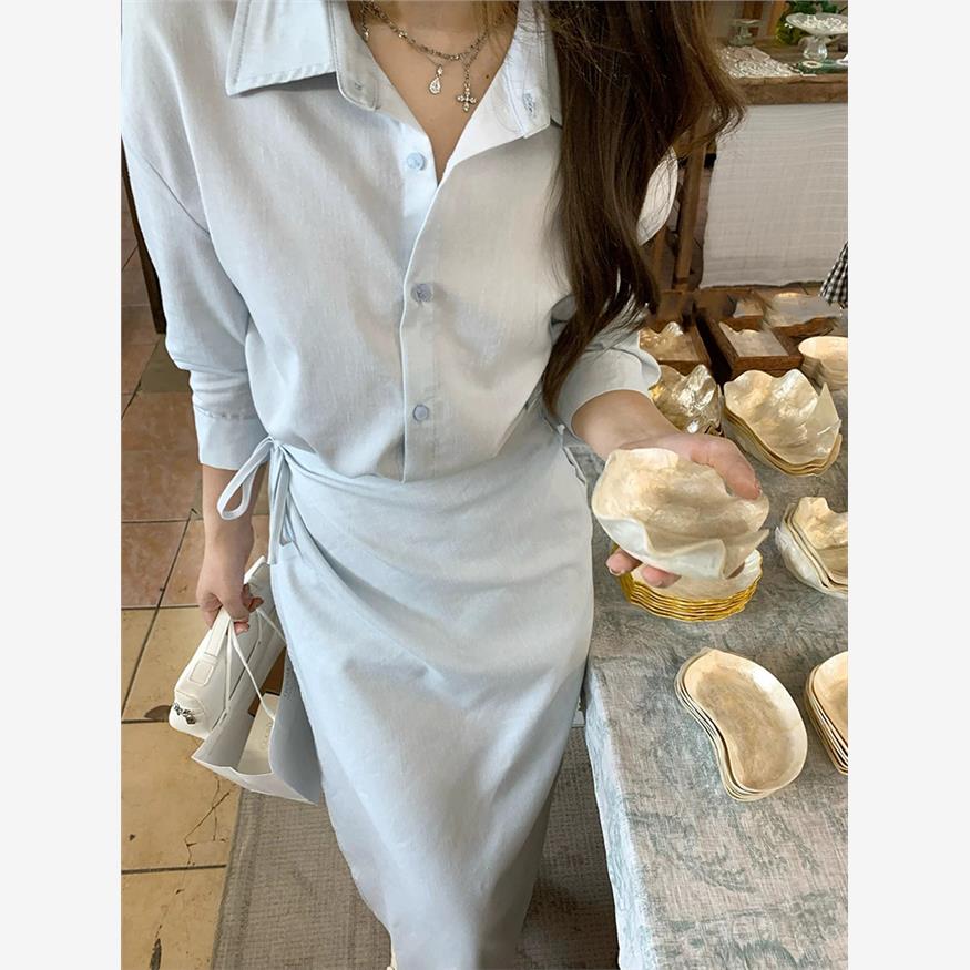 高级感假两件蓝色衬衫连衣裙女早秋季小众设计显瘦气质POLO长裙