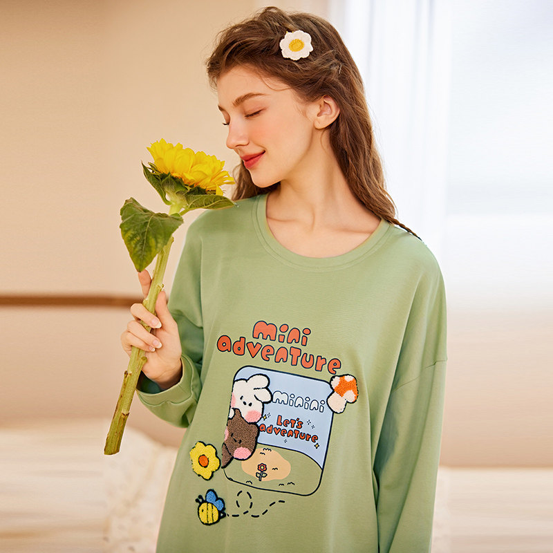 芬腾布朗熊睡衣女春秋季纯棉长袖套装可爱宽松休闲全棉大码家居服