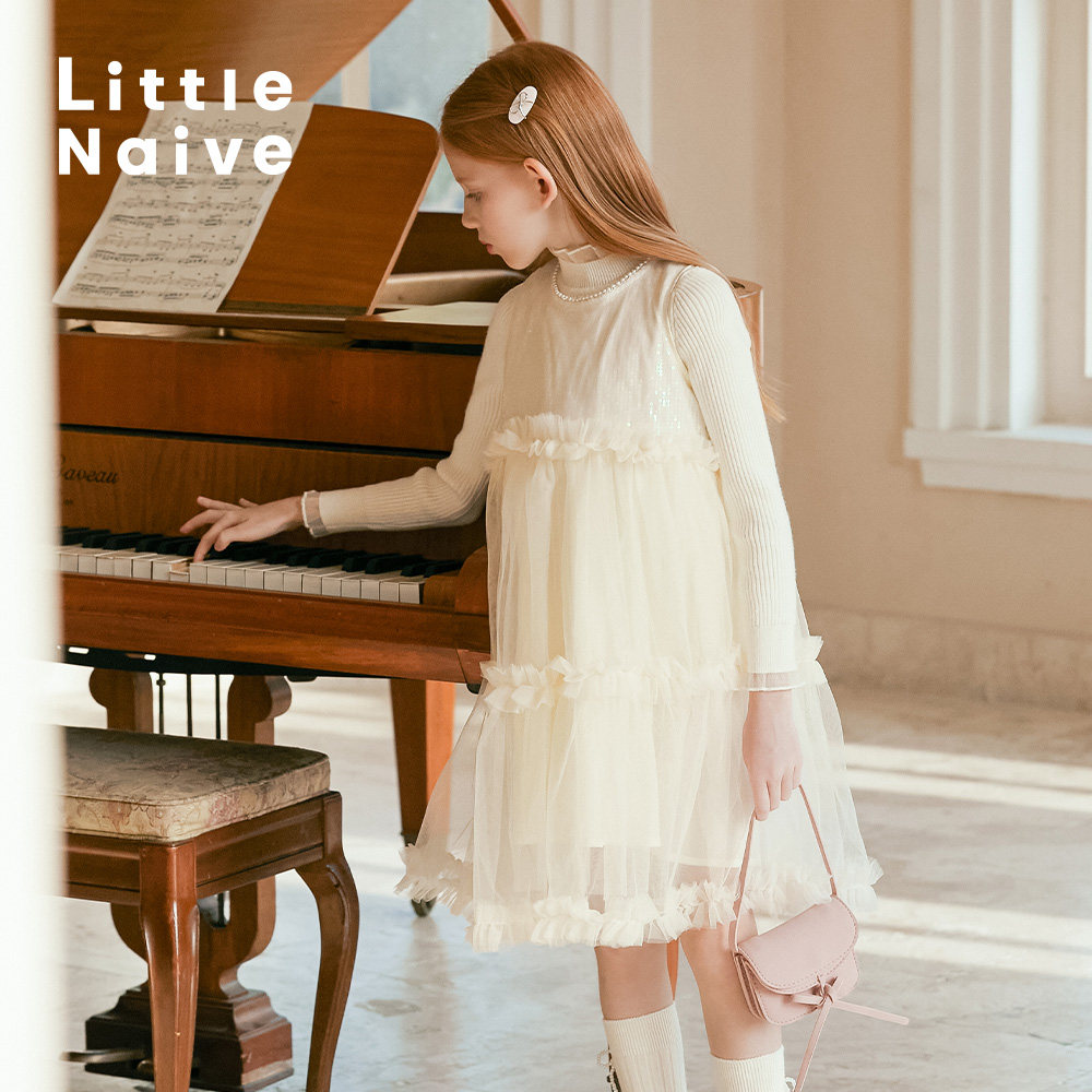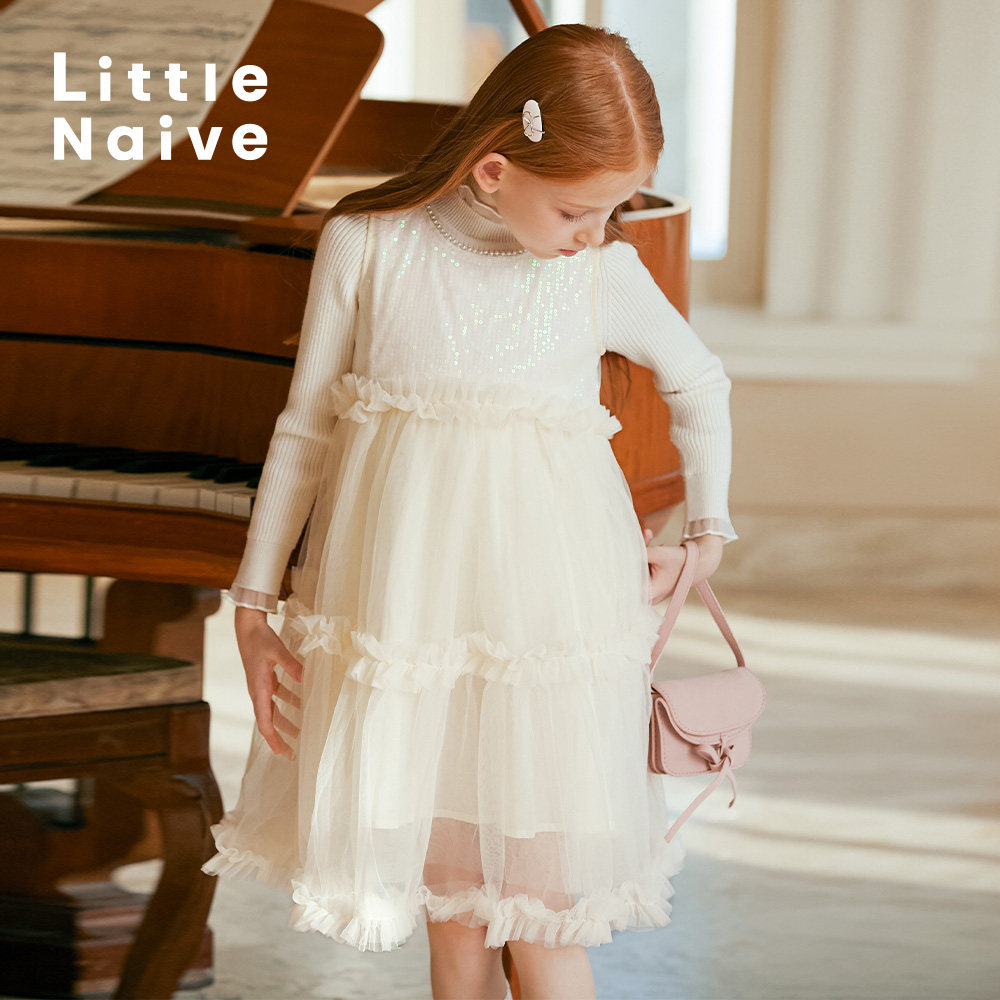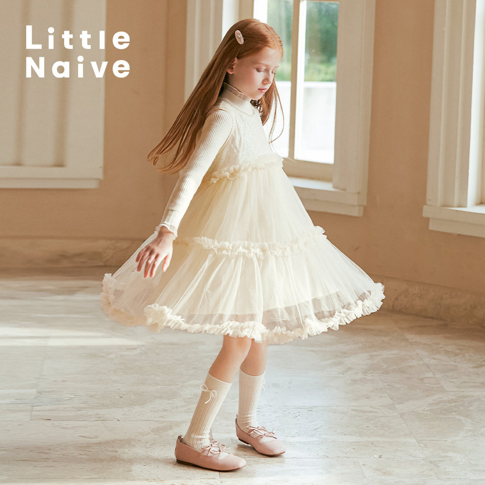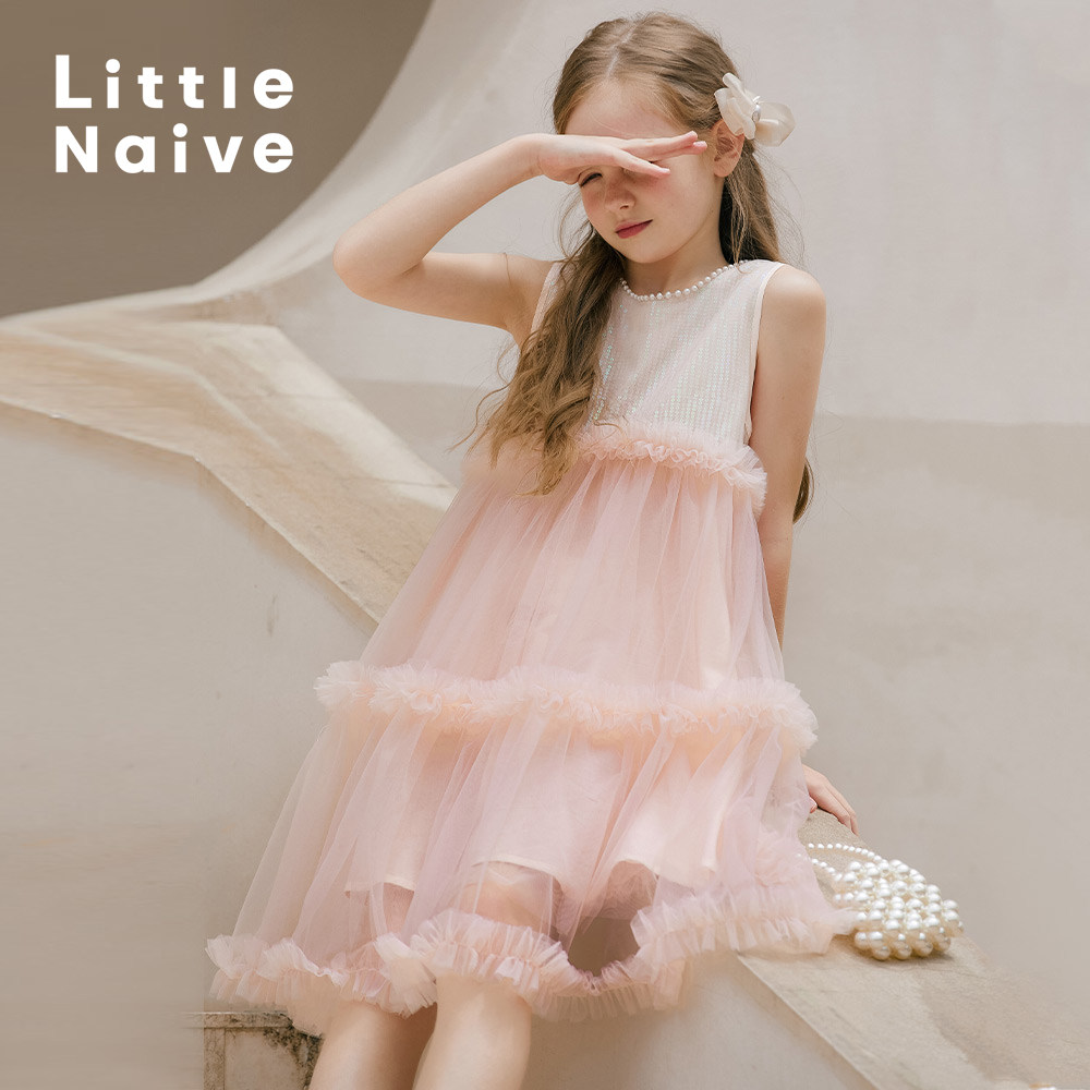 Little Naive春秋儿童白色背心连衣裙无袖公主裙女童生日礼服裙