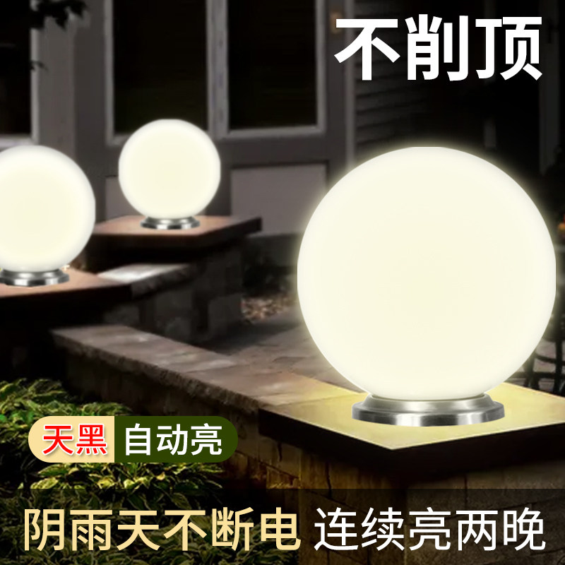 太阳能围墙圆形柱头灯户外防水球形不削顶别墅围墙大门栏杆柱顶灯