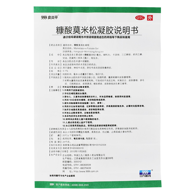 【999皮炎平】糠酸莫米松凝胶0.1%*10g*1支/盒