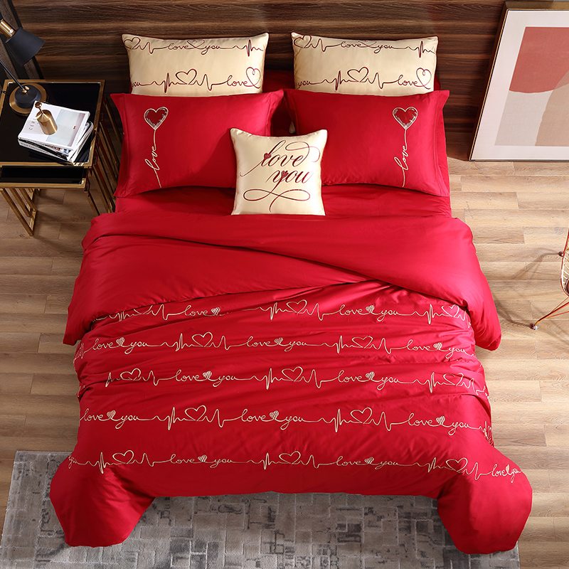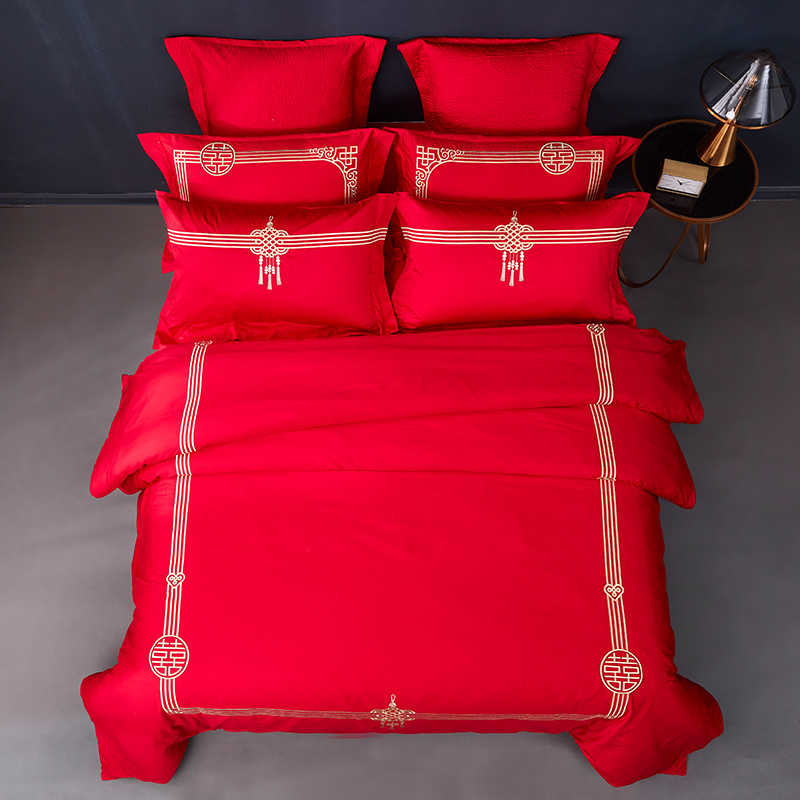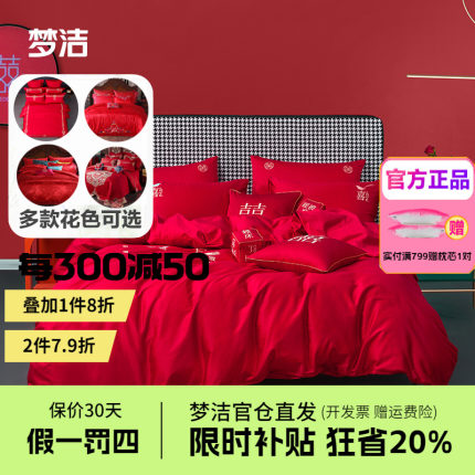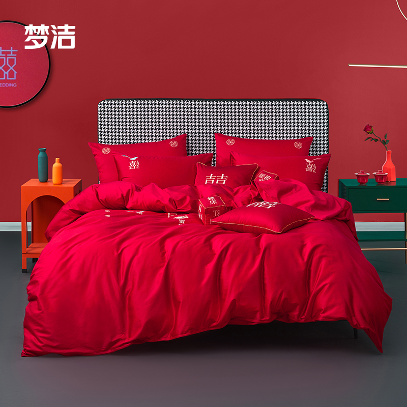 梦洁60支贡缎刺绣婚庆四件套纯棉大红色新婚全棉结婚用品床单被套