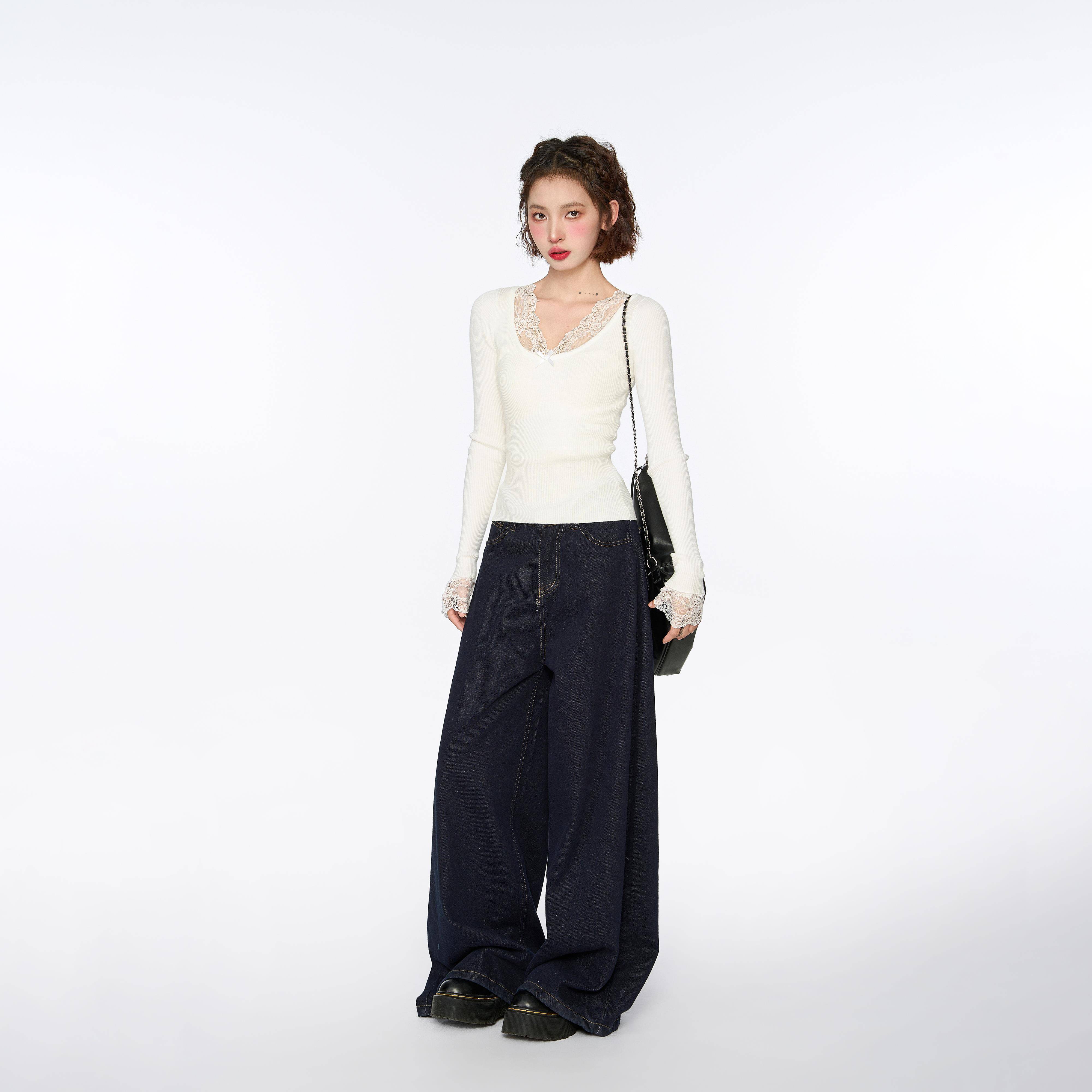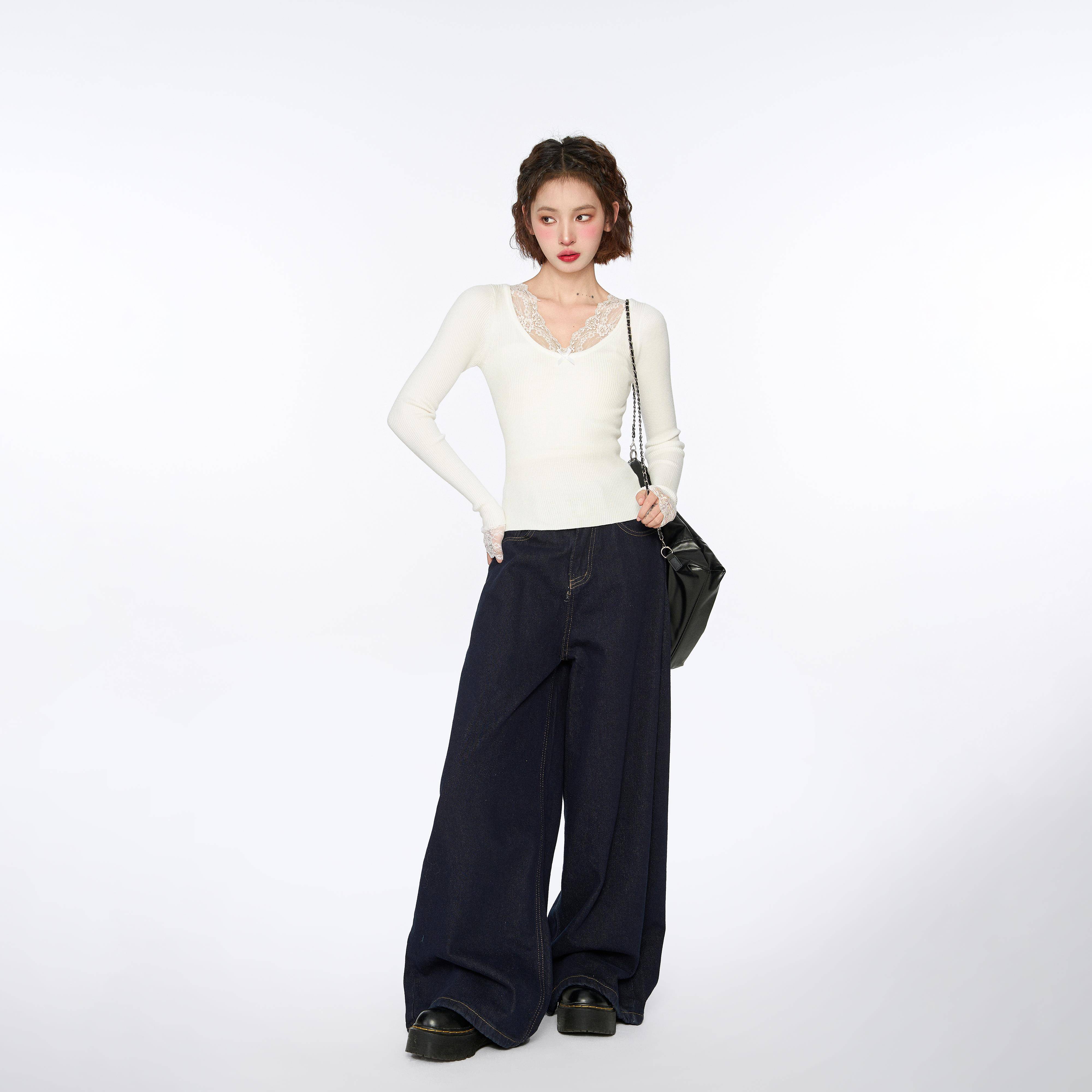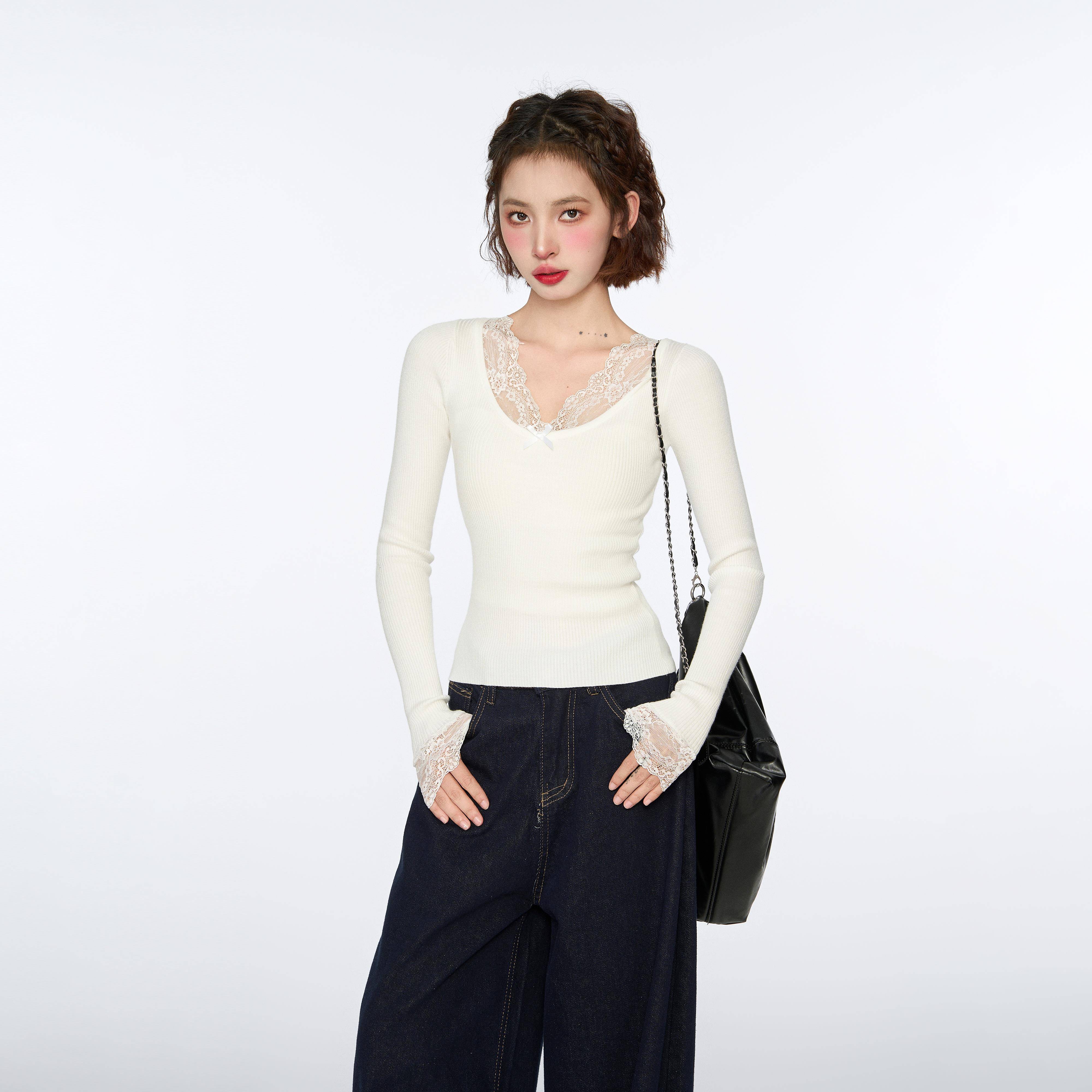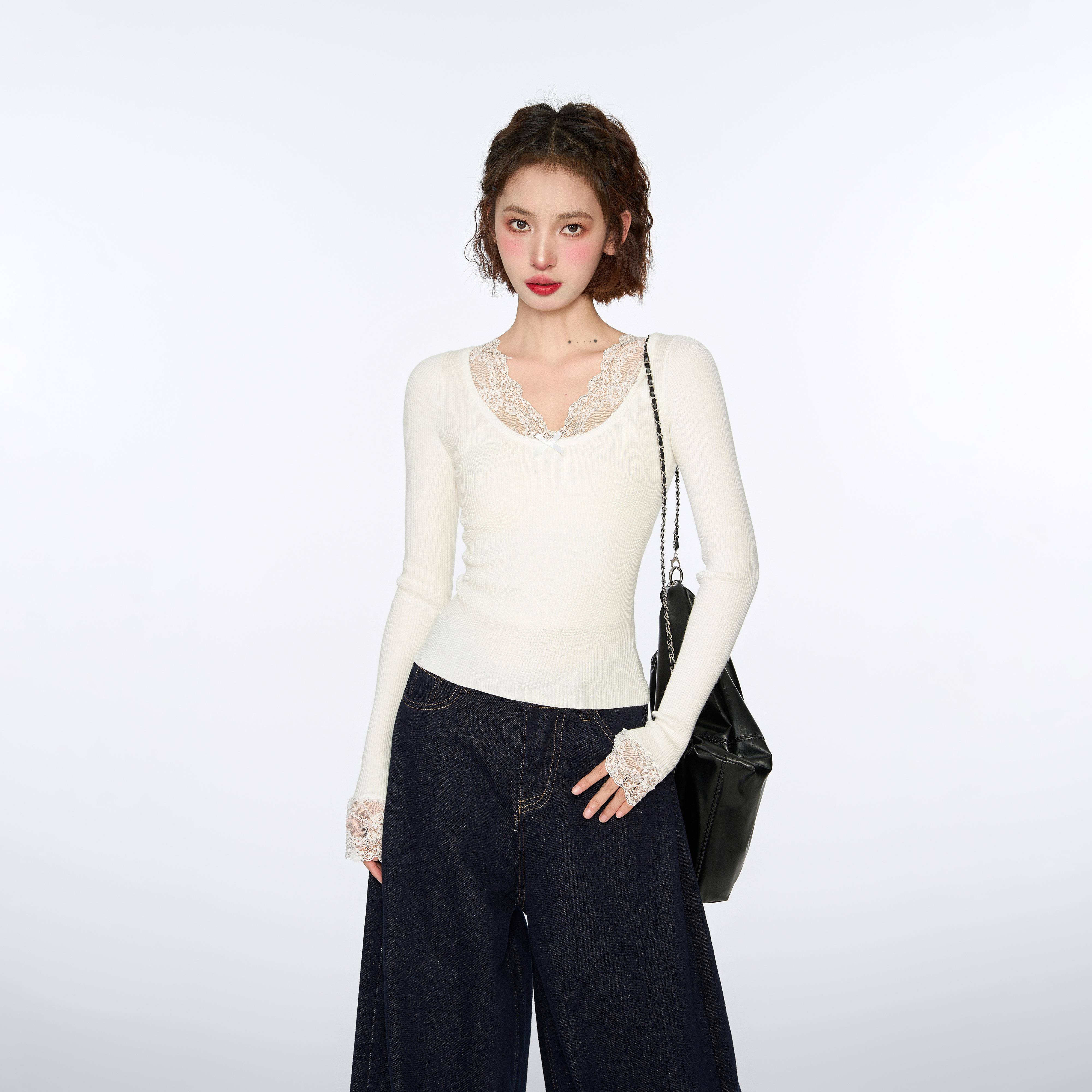 白色蕾丝v领长袖毛衣针织衫女早秋季修身内搭打底衫羊毛纯欲上衣