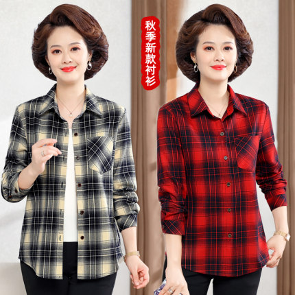 时尚格子衬衫女中年春秋季2023新款妈妈秋装长袖洋气衬衣纯棉上衣