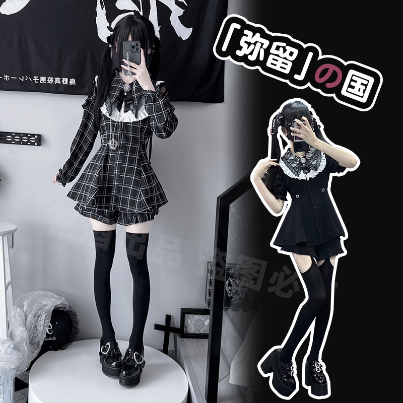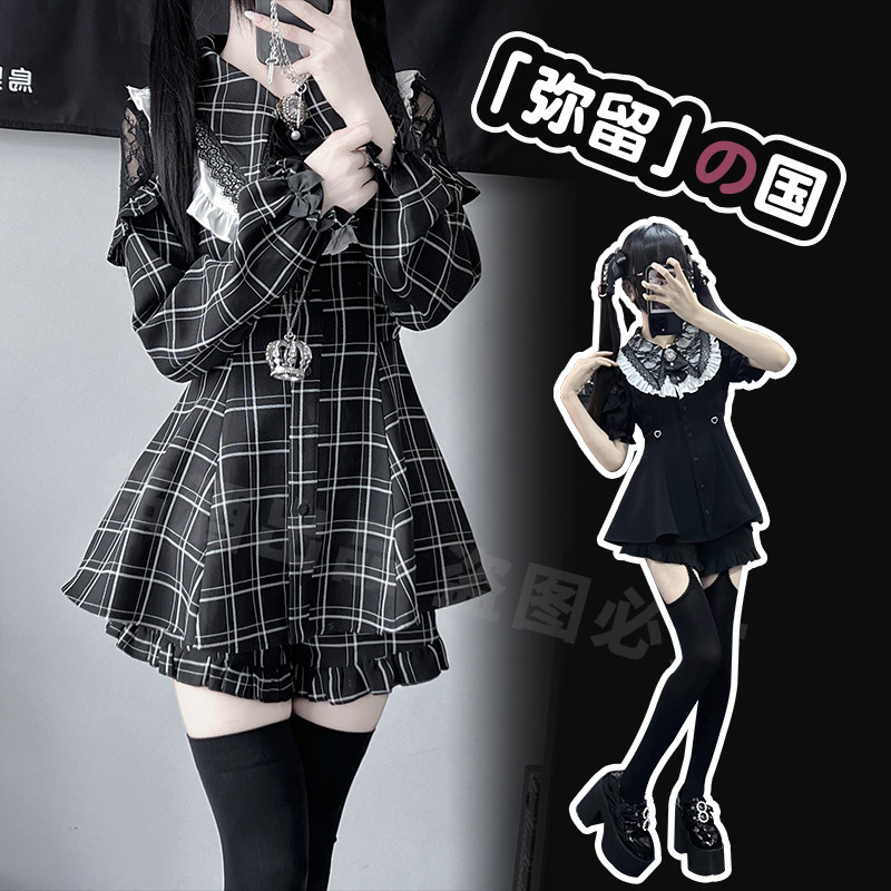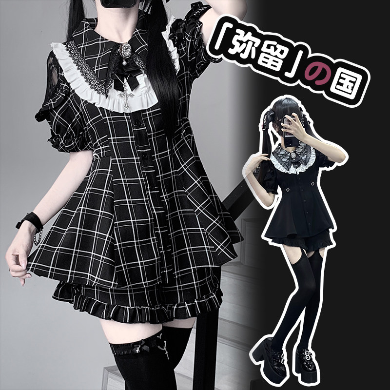 铭酒学园y2k亚文化蕾服夏秋女士蕾丝边短袖长袖格子连衣裙套装