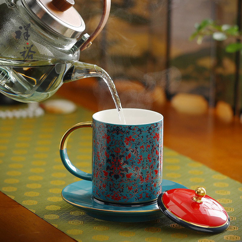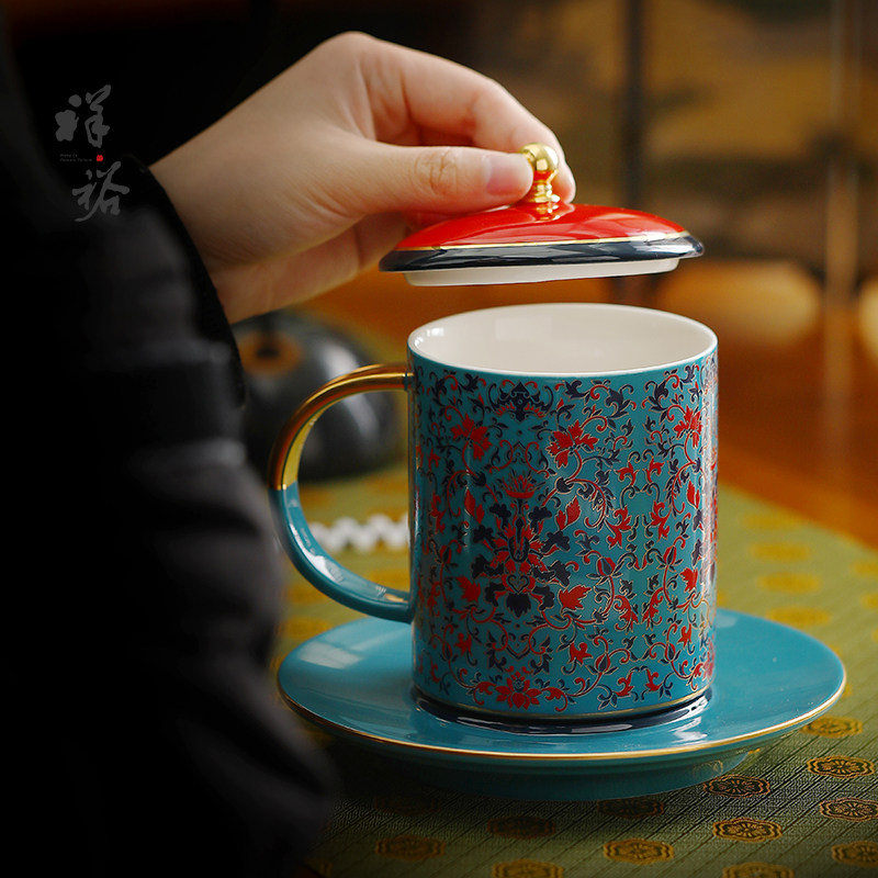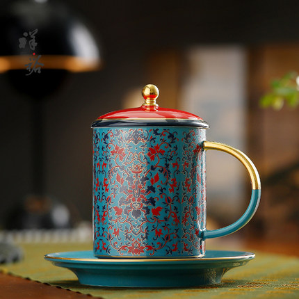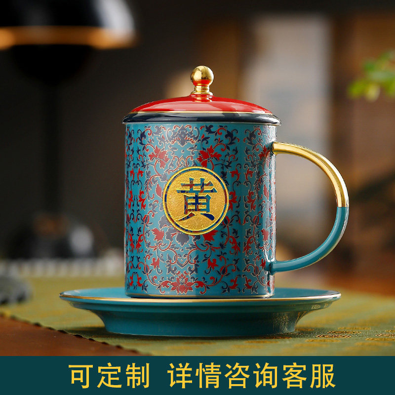祥裕郁郁春华珐琅彩马克杯定制刻字陶瓷个人杯带盖宫廷办公杯送礼